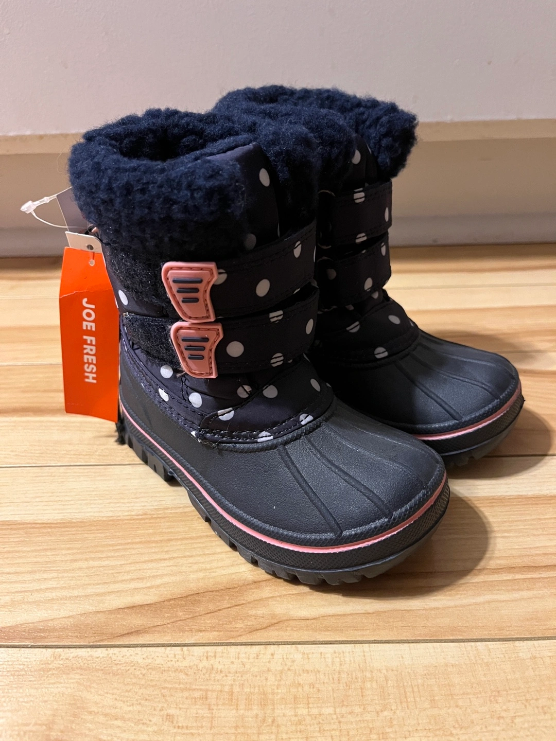 New- Toddler Girl Navy blue winter boots with white polka dots. Fleece lined. Velcro closures. Size 6.