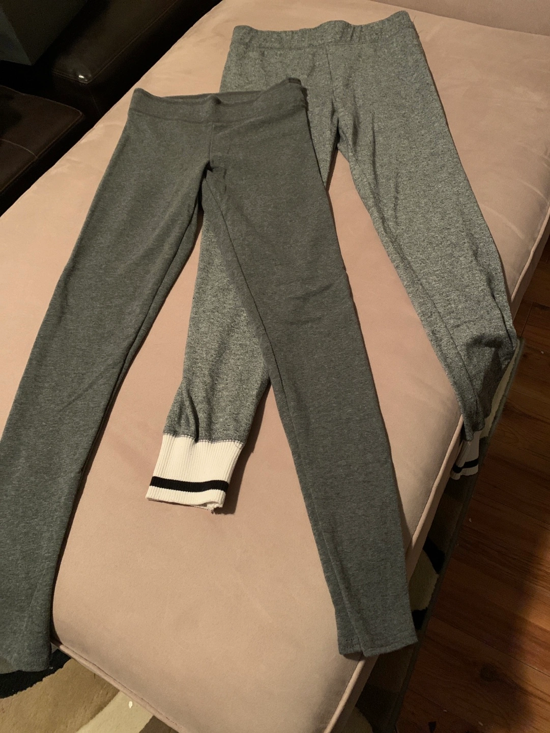 Two pairs of grey leggings. One pair with a white and black stripe at the bottom. The darker pair is Garage, size XS. The lighter pair is Bluenotes, size M, but fits small.