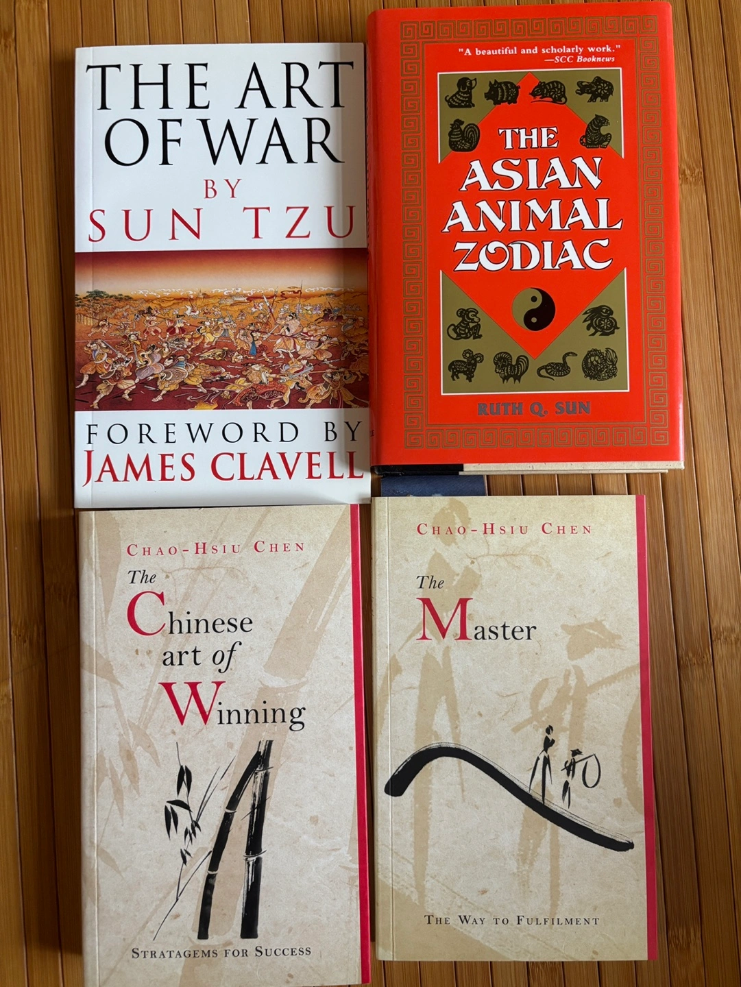 Set of 4 books on Chinese philosophy and culture. Includes: The Art of War by Sun Tzu, The Asian Animal Zodiac by Ruth Q. Sun, The Chinese Art of Winning, and The Master by Chao-Hsiu Chen.