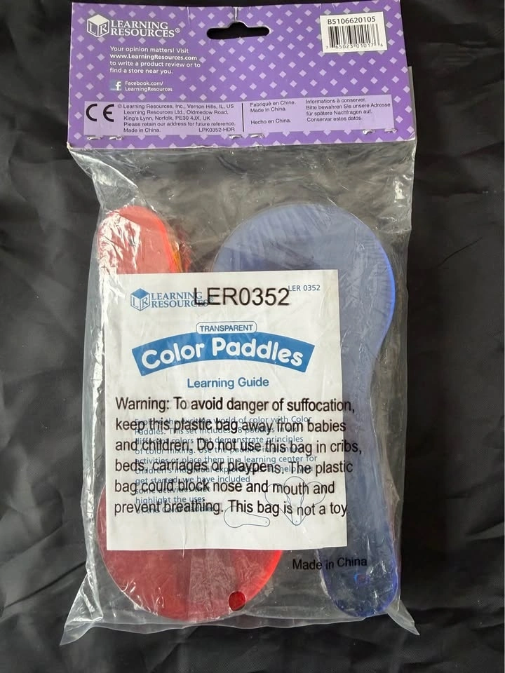 New set of 18 color paddles to allow exploration of colour mixing. 3 each of red, orange, yellow, green, blue, and violet.