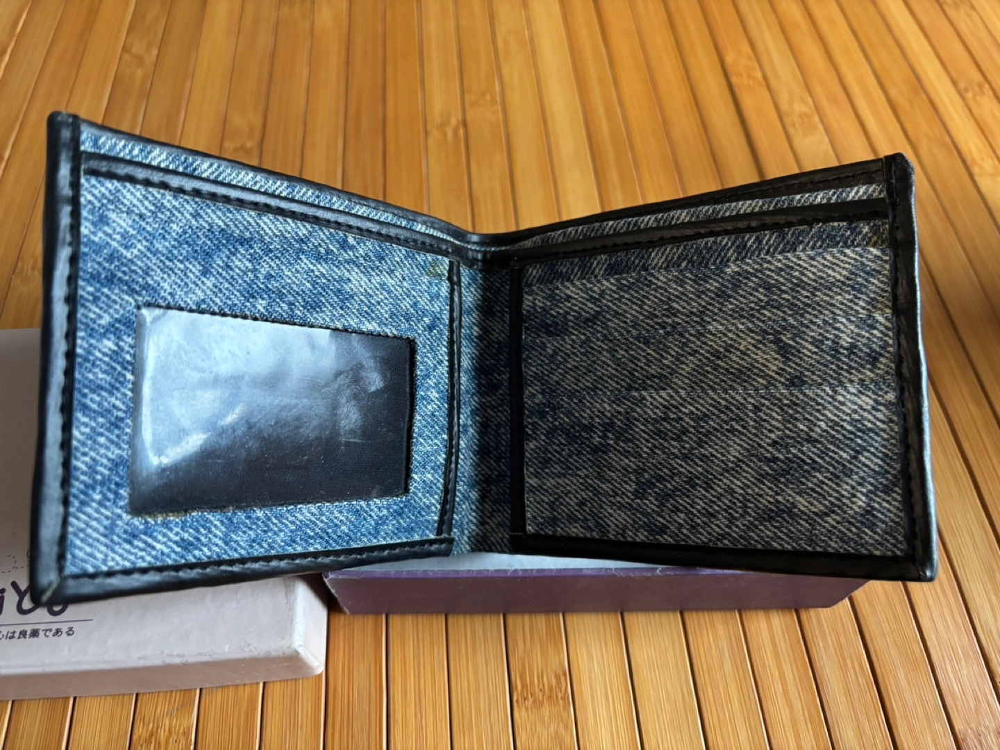 266Wallet made with Levi's denim jeans and black leather trim. It has a clear plastic window for ID. Brand new. Never used.