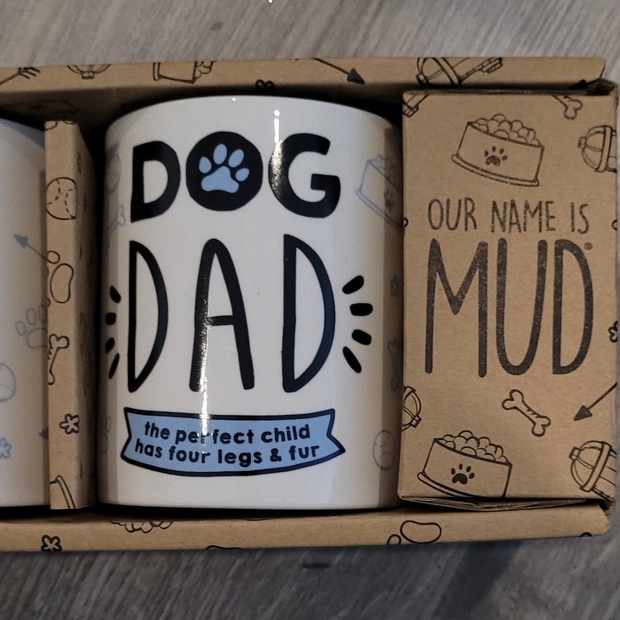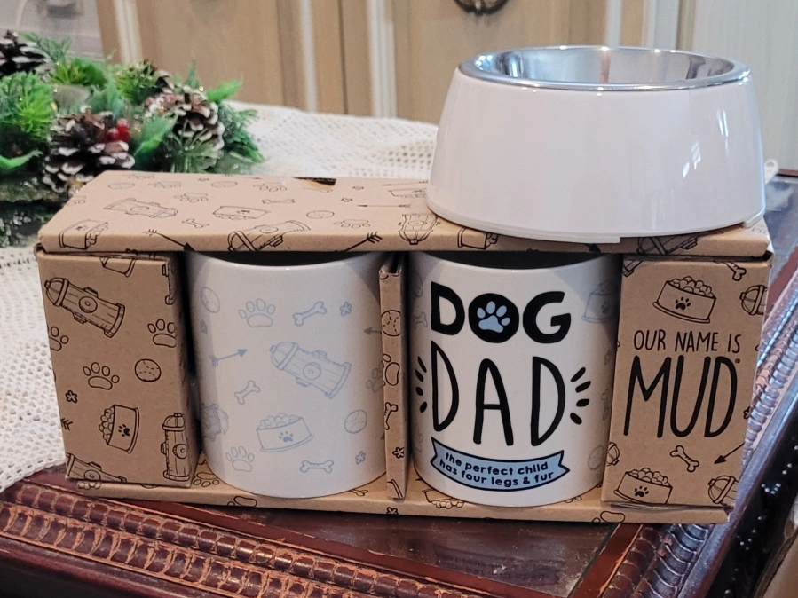 Set includes a mug and bowl. The mug has a dog paw print design and says "Dog Dad: The perfect child has four legs & fur." The bowl is stainless steel with white on the rim.