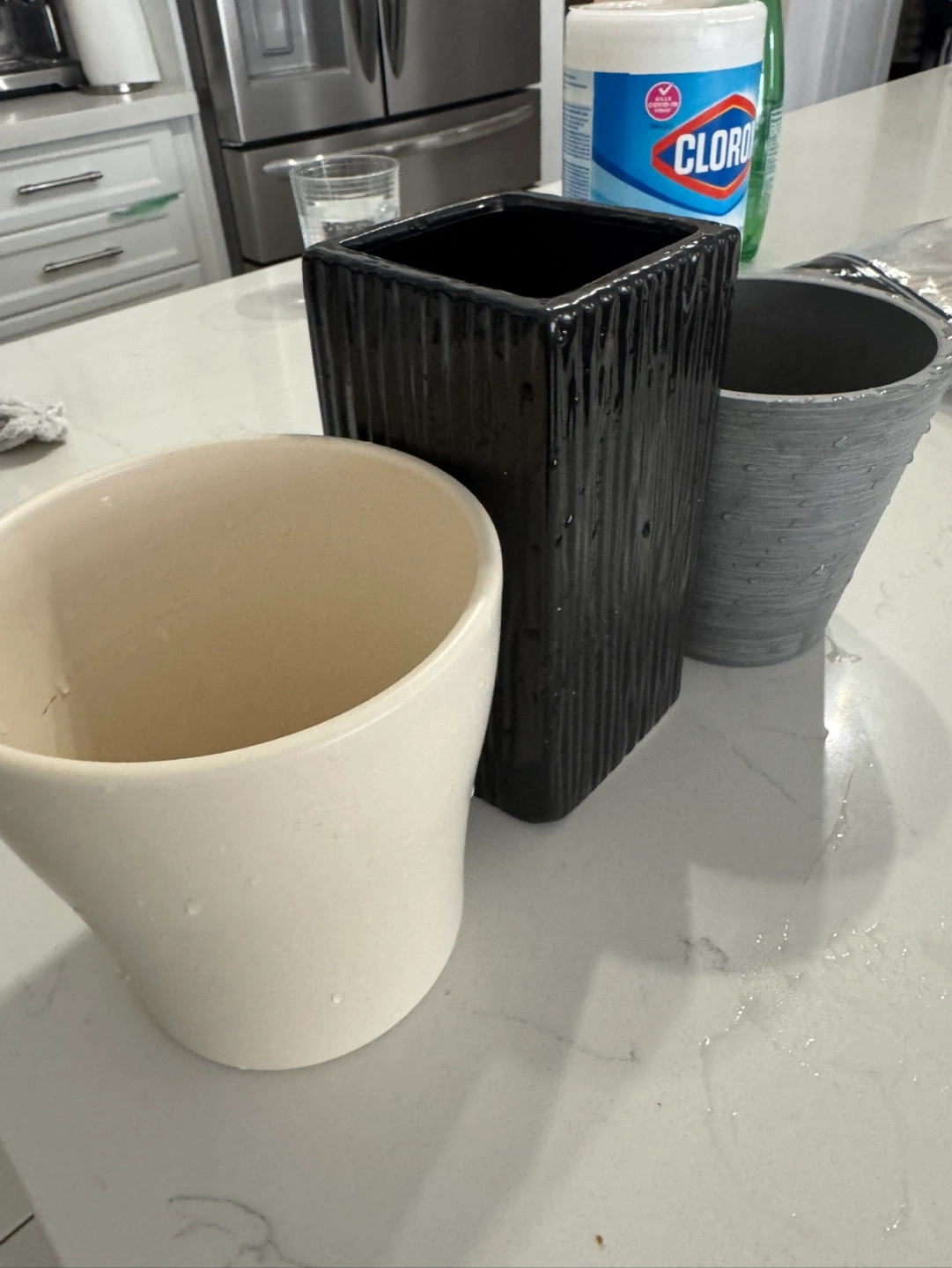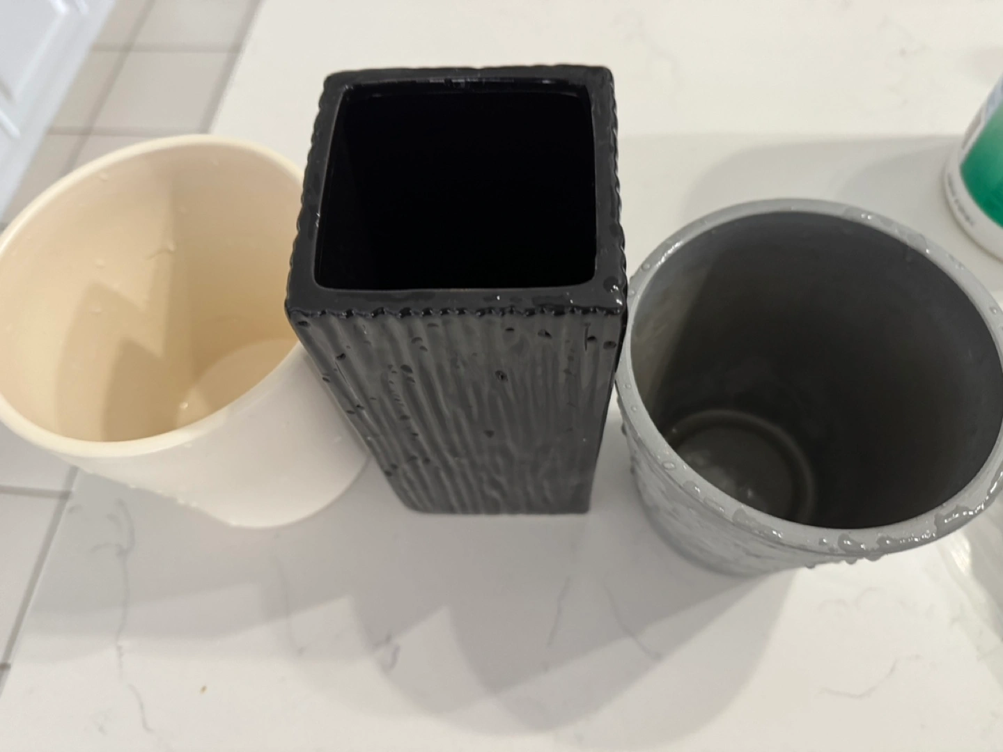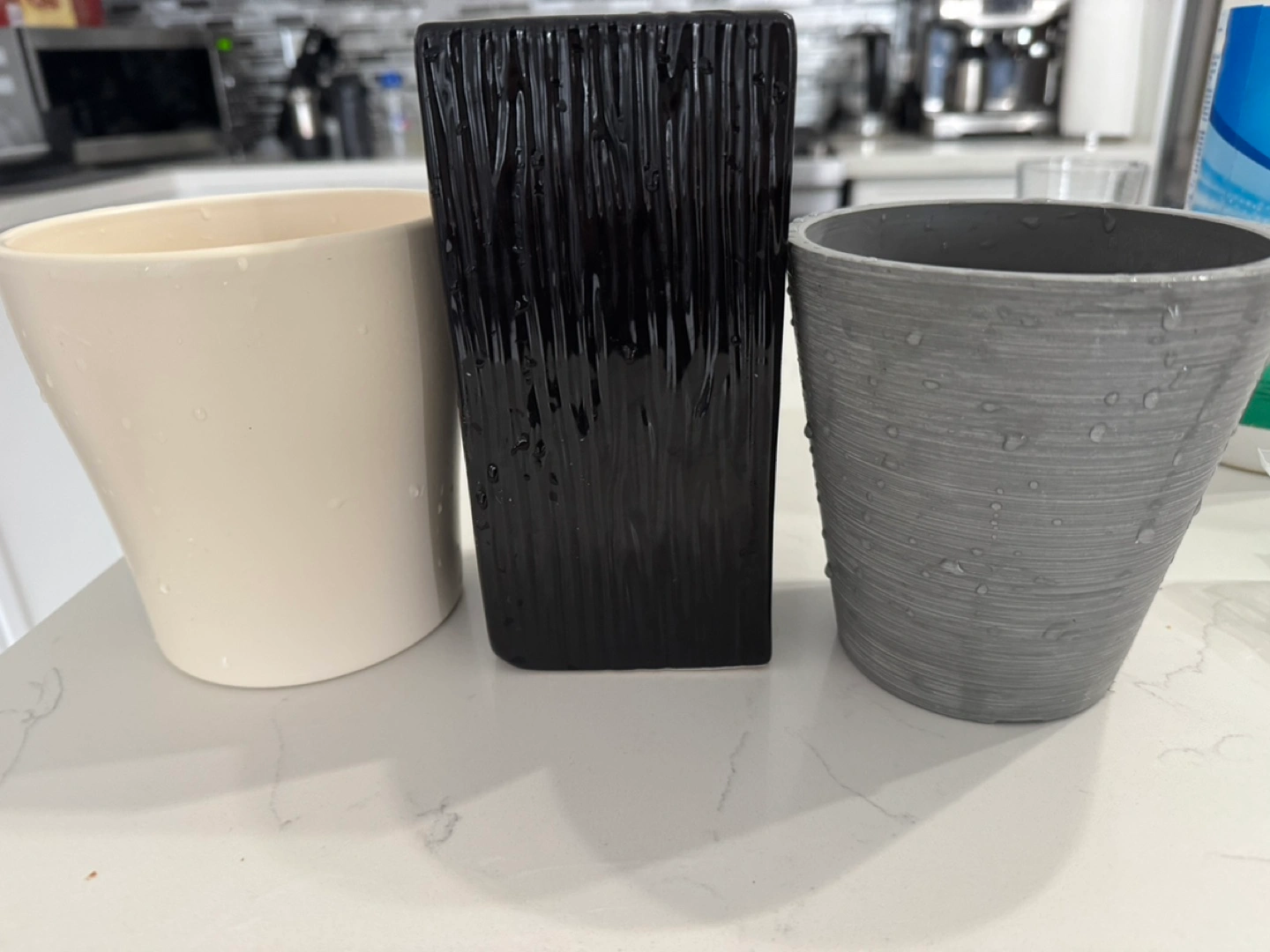 Set of 3 ceramic planters. One is white, one is black with a textured finish, and one is grey. All are in good condition.