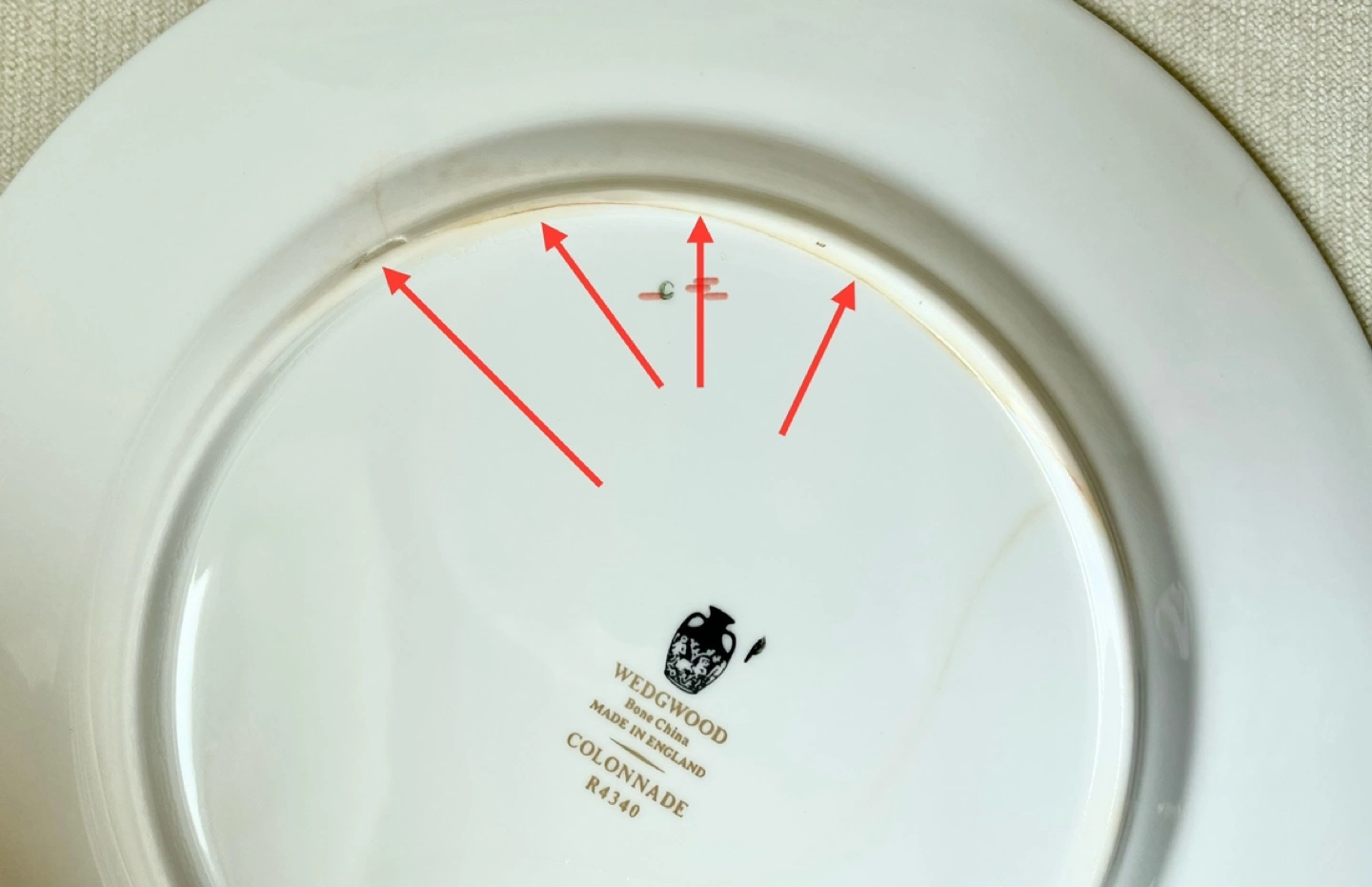 - Hairline crack, light staining. Still fully intact.