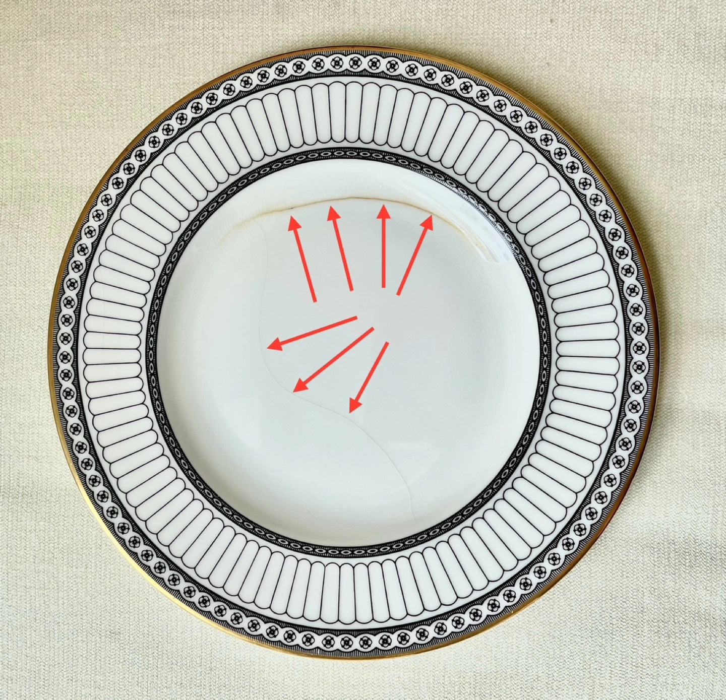 This plate has a hairline crack running around part of the inner rim. It is still very good for use as a decorative setting or a display piece for staging or theater props.