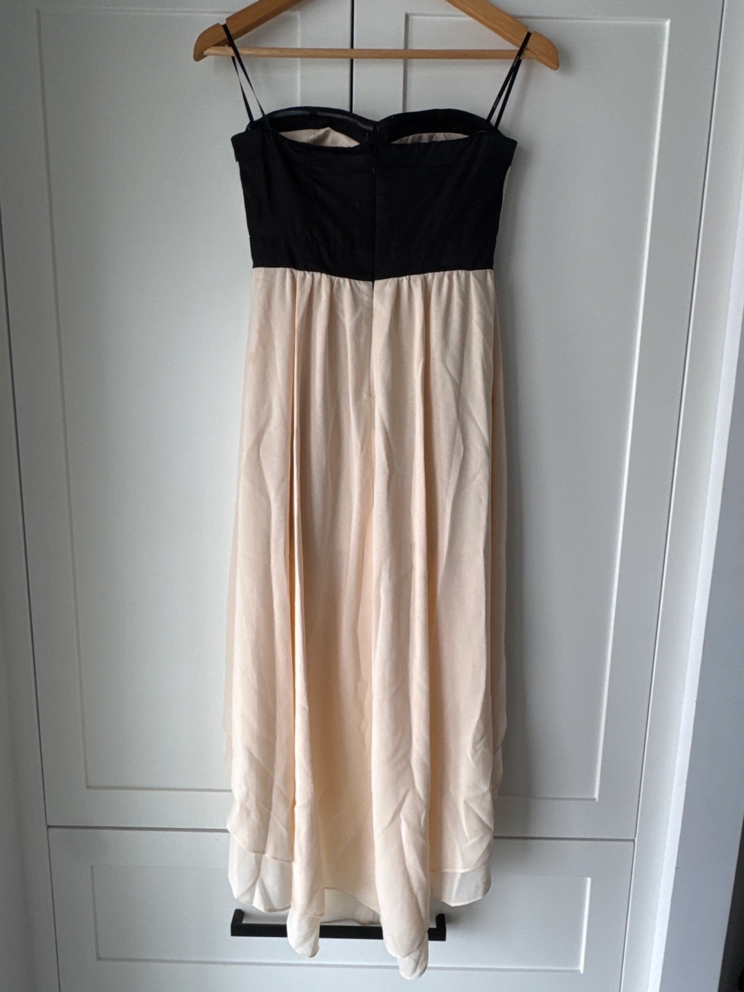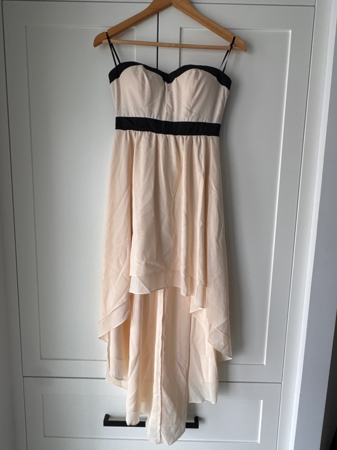 Strapless high low dress with a black bodice and a creamy pinky skirt. Size XS.