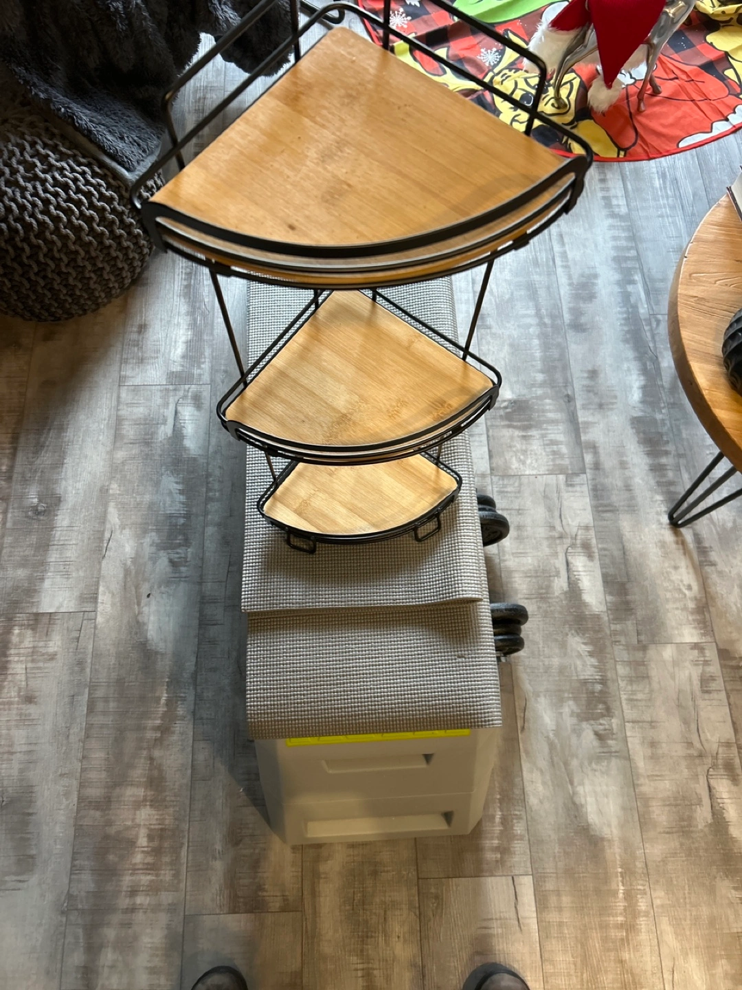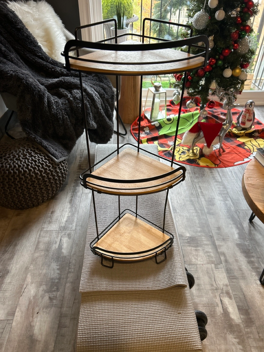 Three-tier corner shelf unit. Black metal frame with wooden shelves. Great for a bathroom or kitchen.