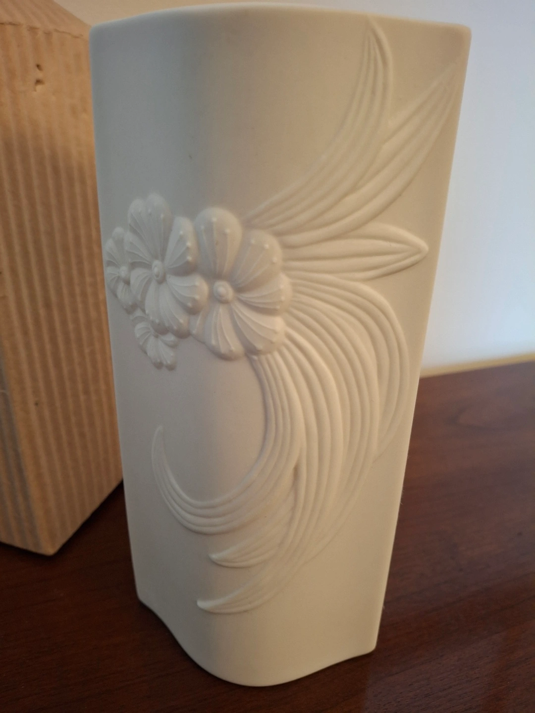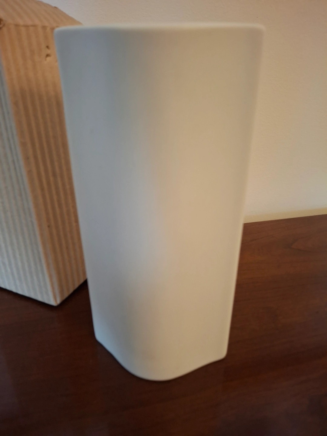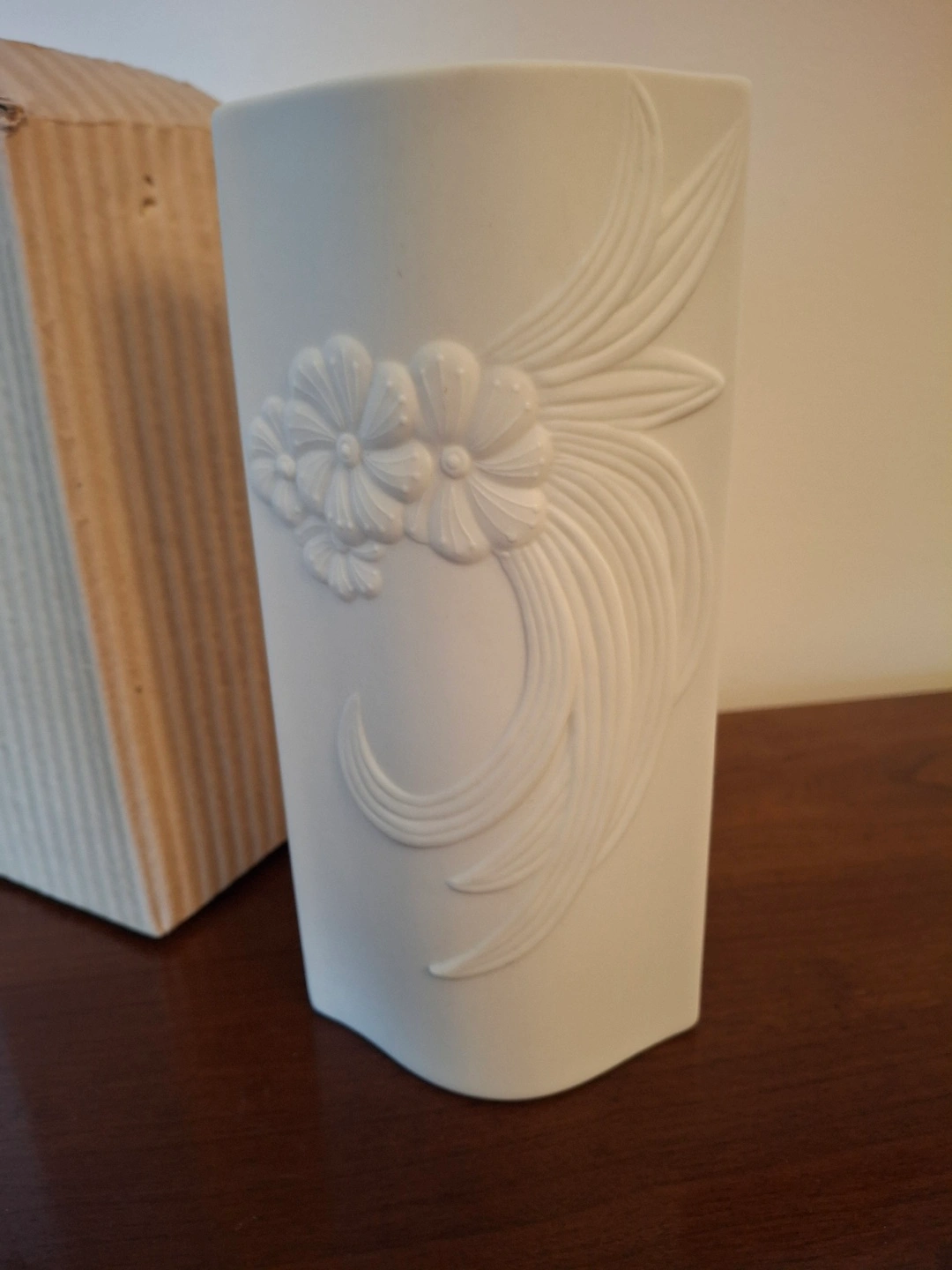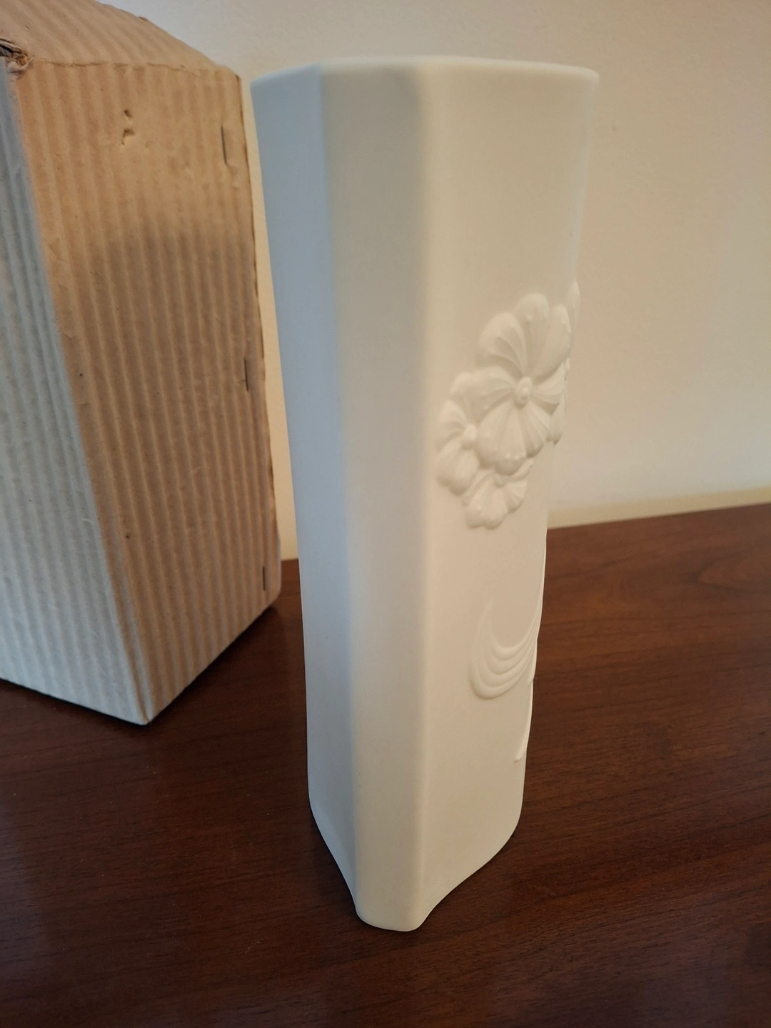 1000+Ivory flower vase, sleek & modern looking with floral design. 8” high, and 3.5 x 2.5 wide at mouth. Never been used, sticker still on the bottom. Comes in original box. Available for pickup in Markland Wood.