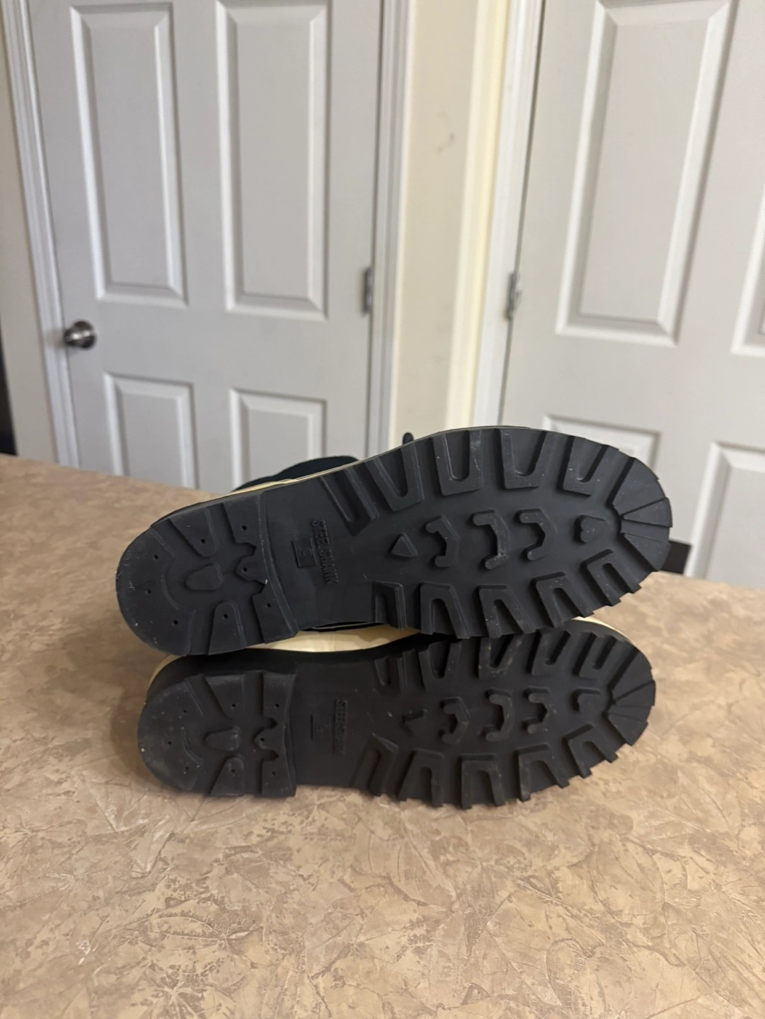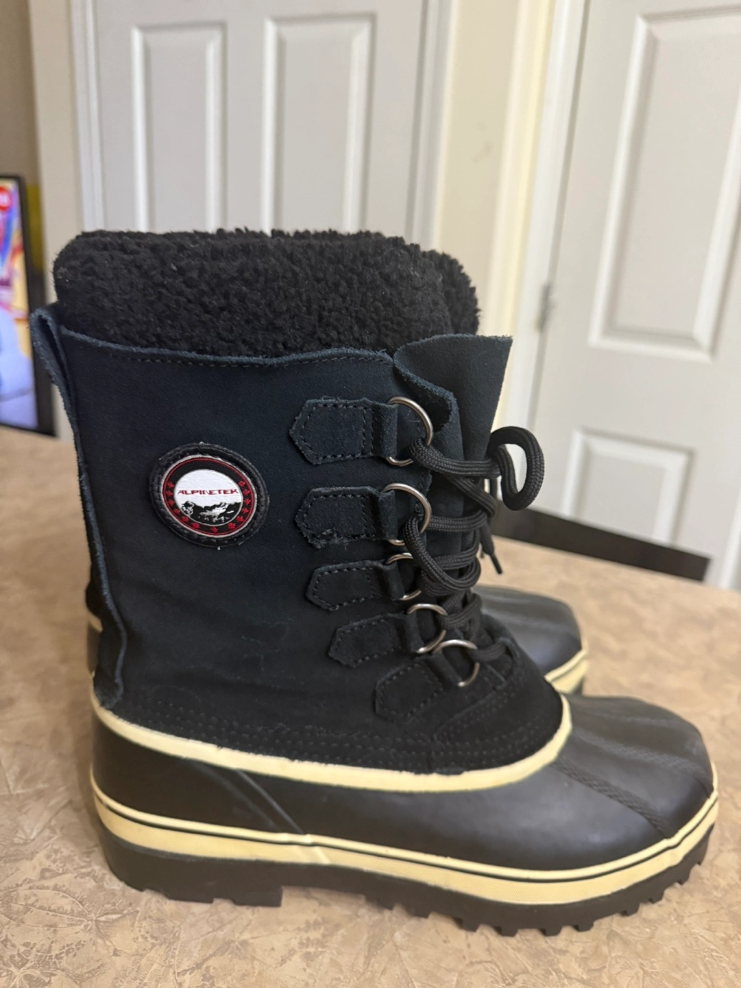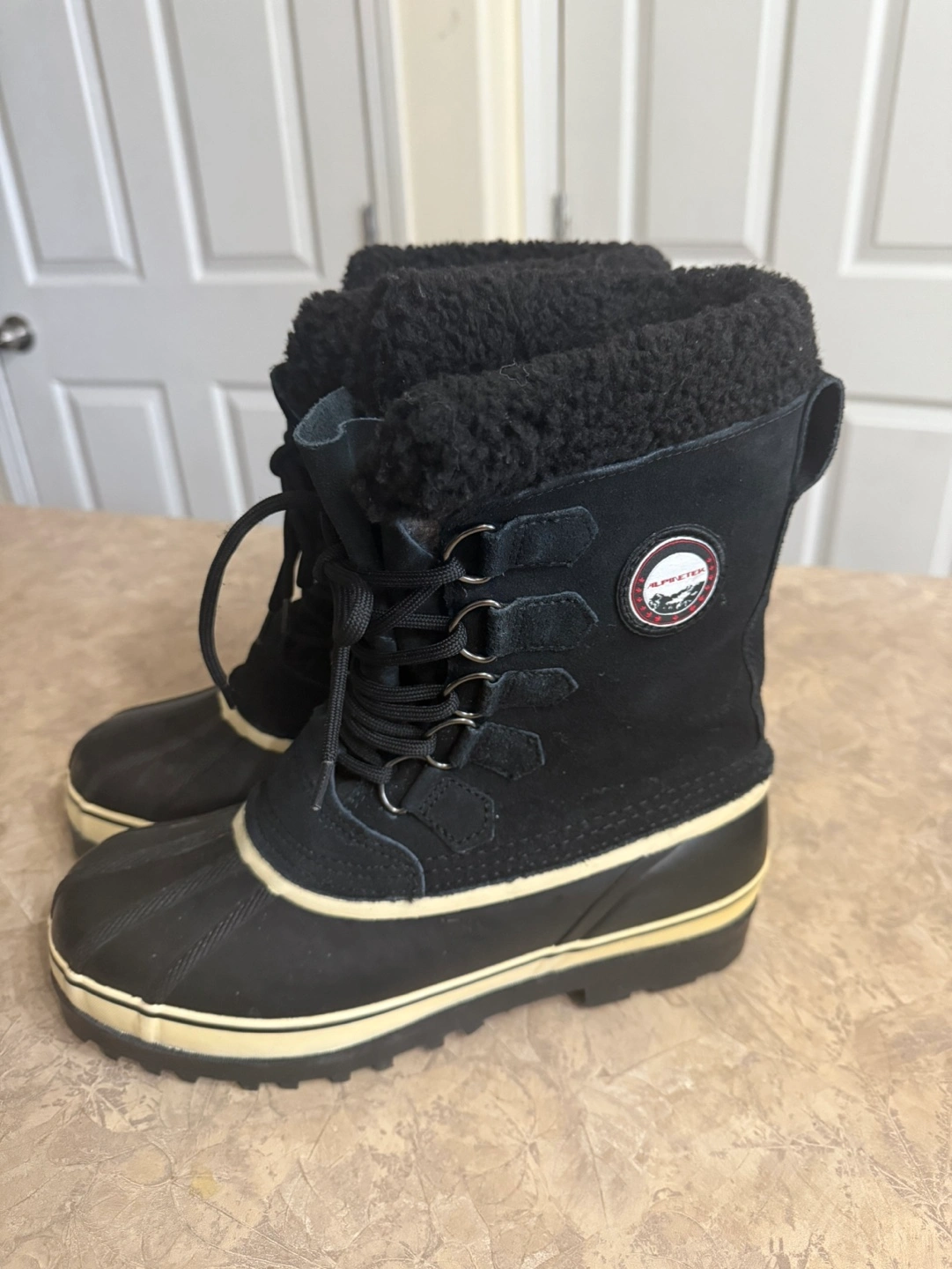 Black winter boots with a lace-up closure. They have a black rubber sole and are lined with black fleece.