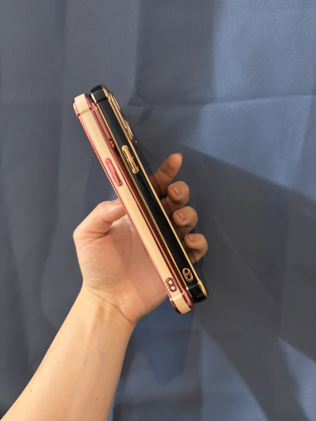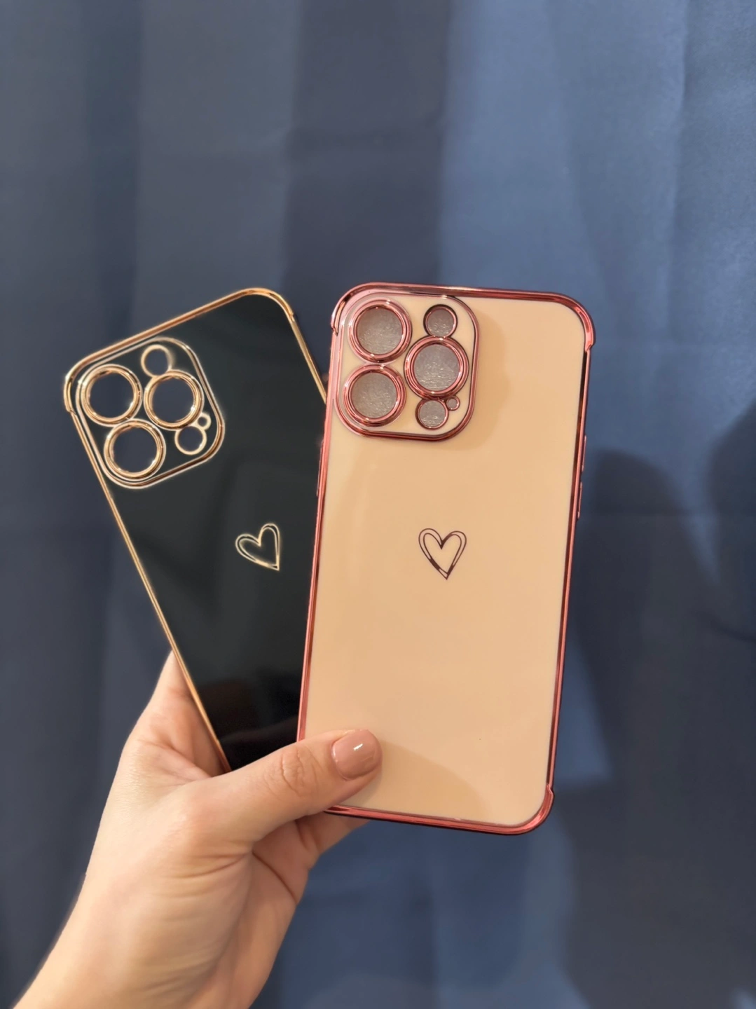 264Two iPhone cases. Both have a gold trim and a heart on the back. One case is black, the other is beige.