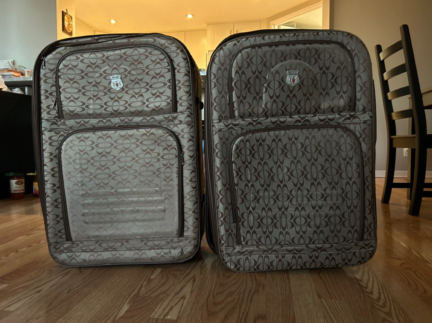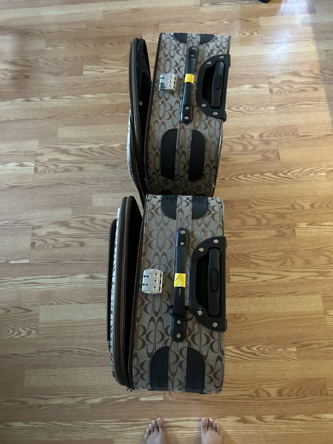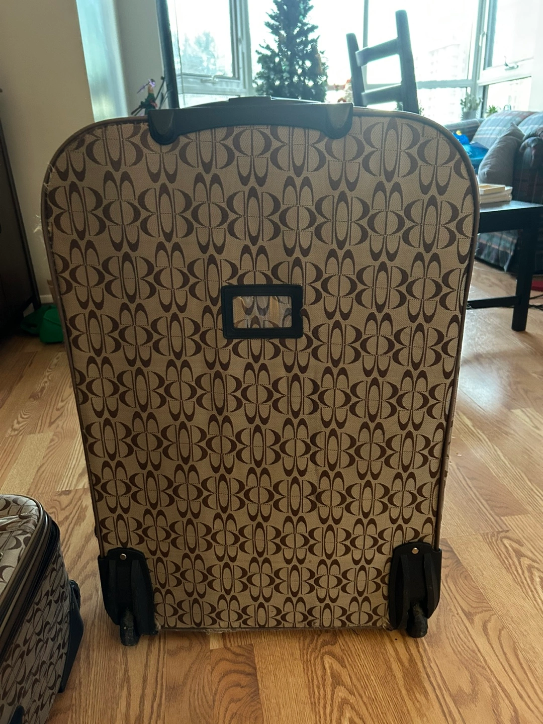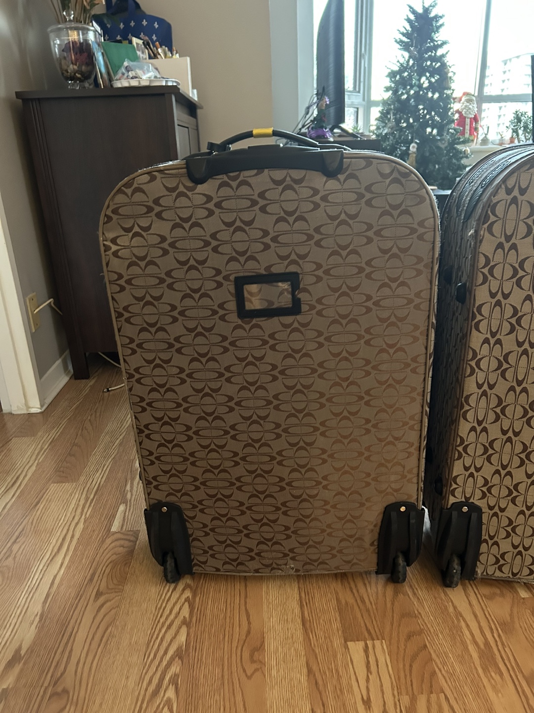 Set of two large suitcases with rolling wheels. Brown and black pattern. Large fully functional suitcases, well used but still in good working condition. Message if you want any specific pictures that aren’t already included! Size. Height: 28 in/71.5 cm