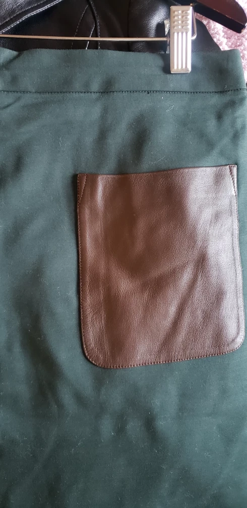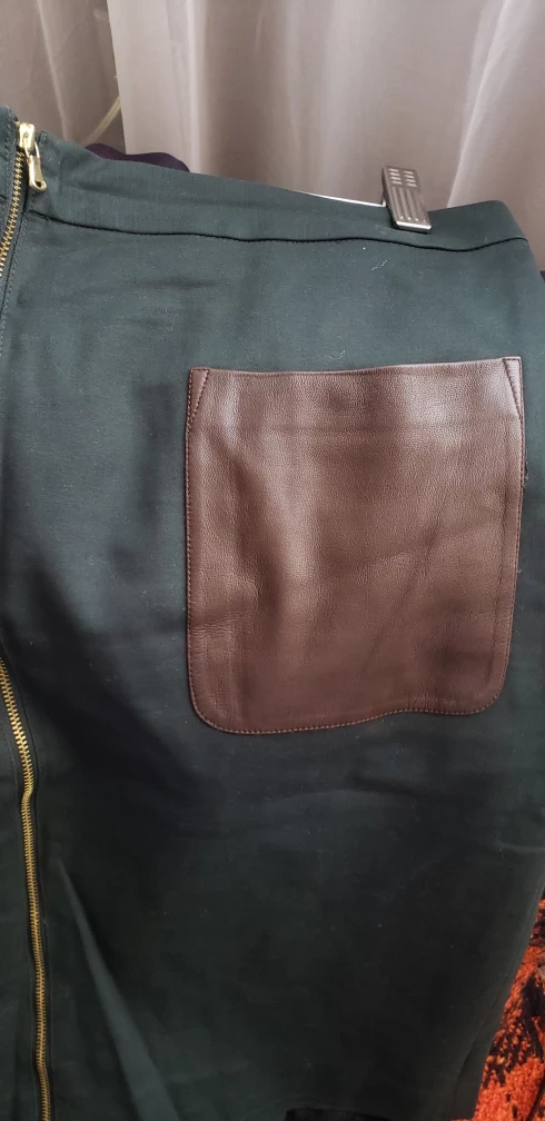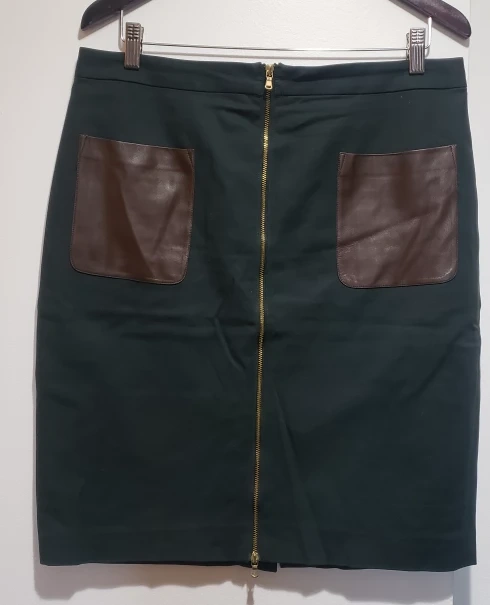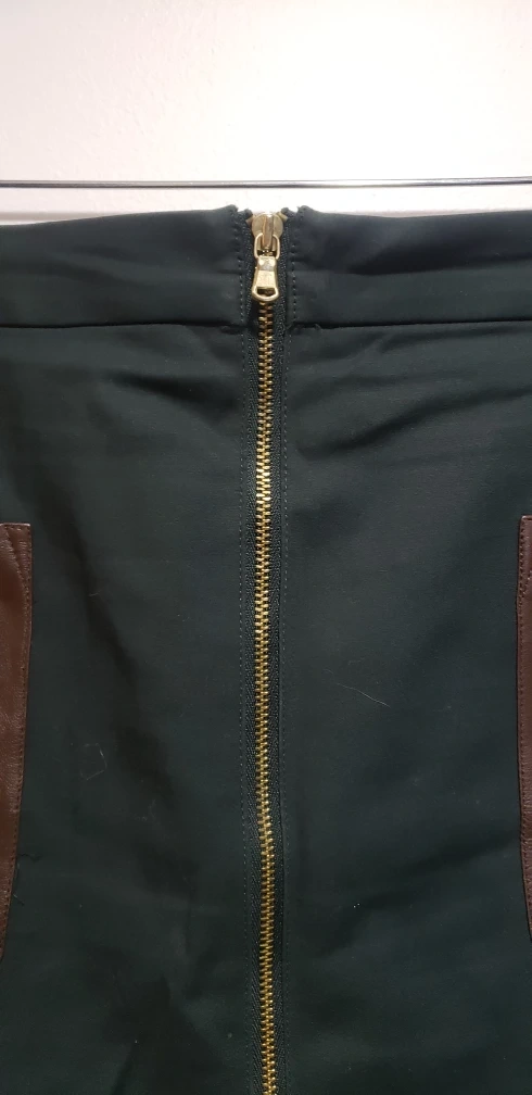 23deep green gull zipper top bottom. Brown leather front pocket detail. 17" waist, 20" hip, 22" long. Cotton/rayon/elastine. Great condition.
