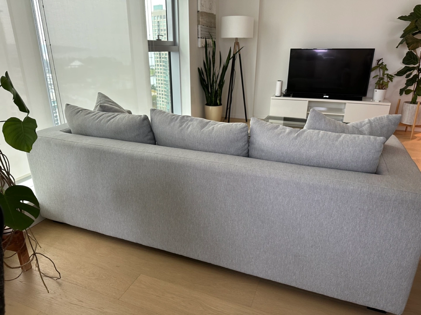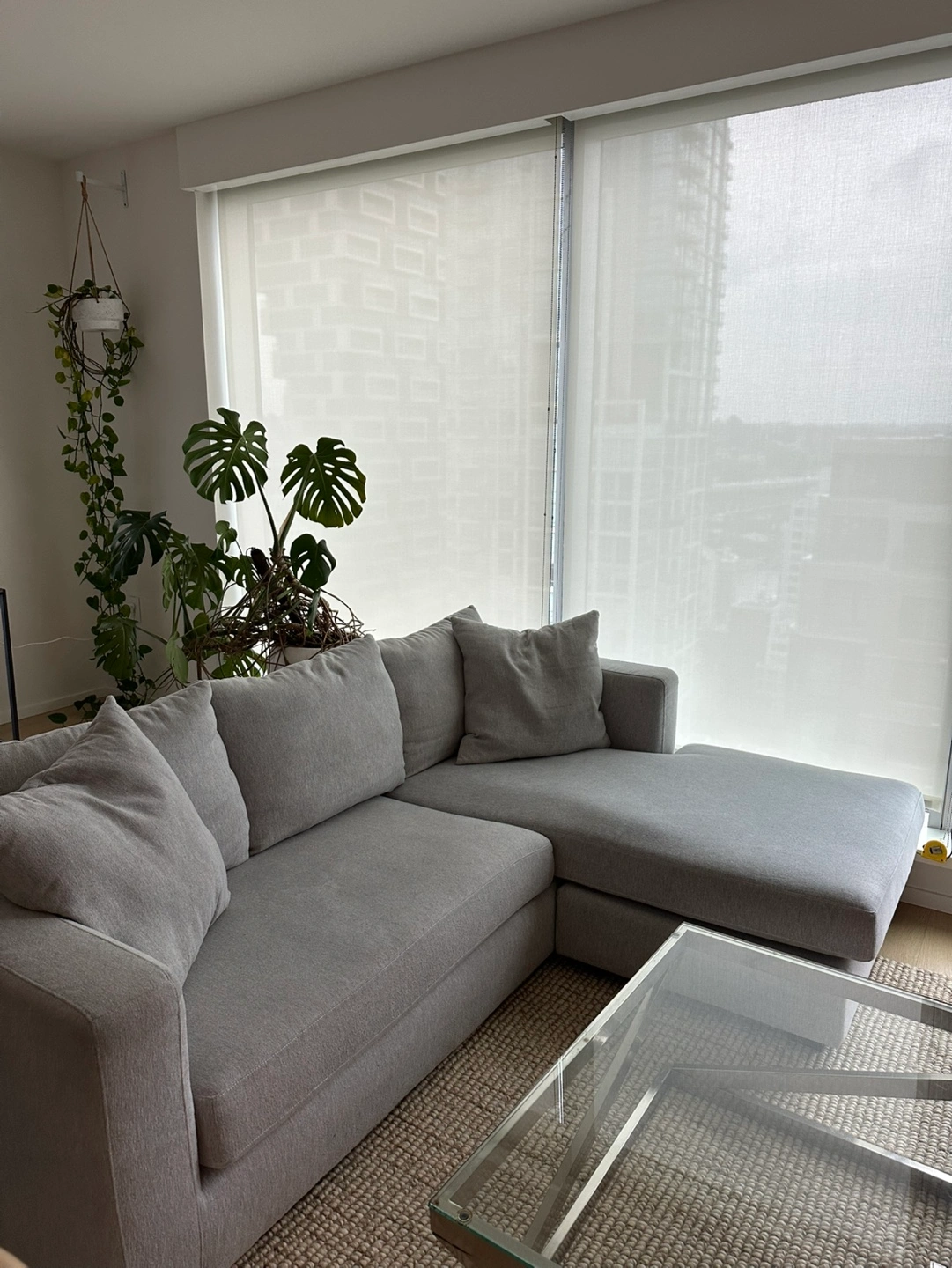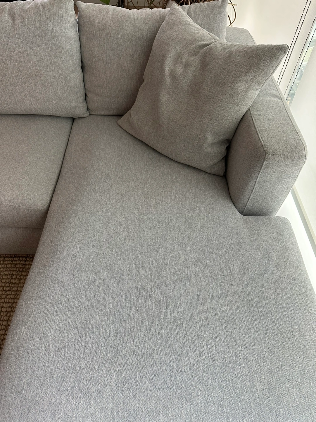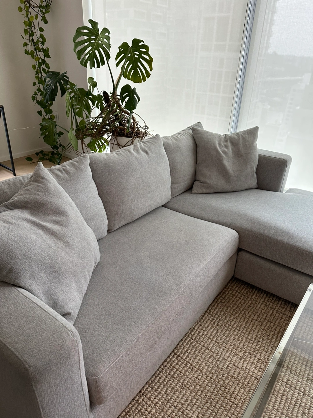 Grey sectional sofa with a chaise lounge. Includes throw pillows. Good condition, no visible stains. Originally from Costco and priced at $1600.