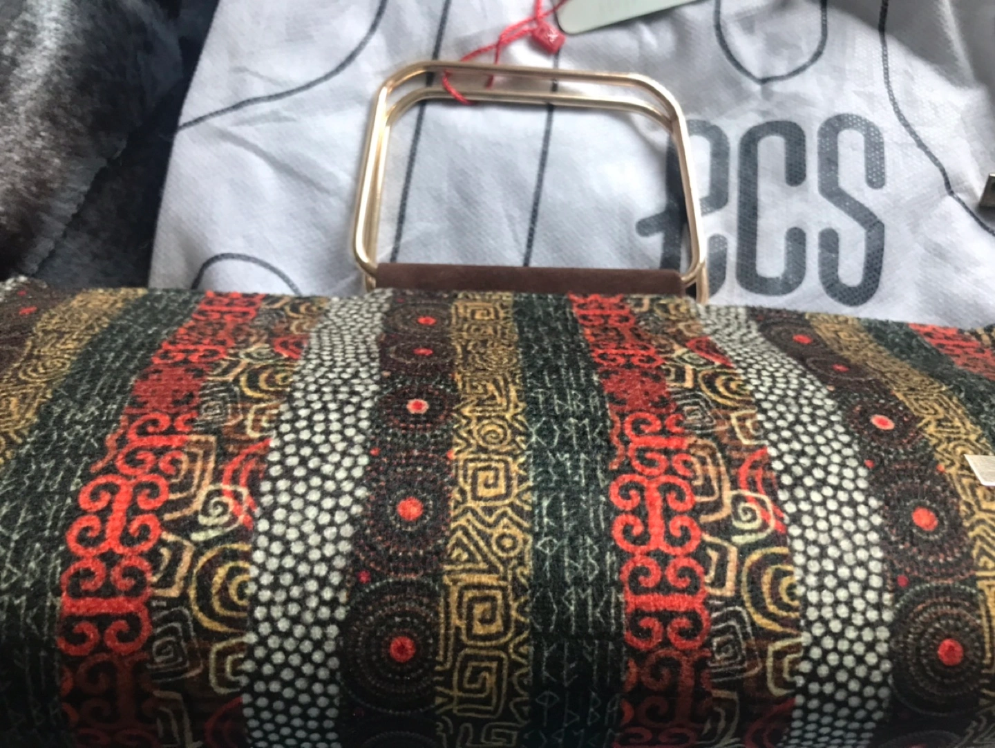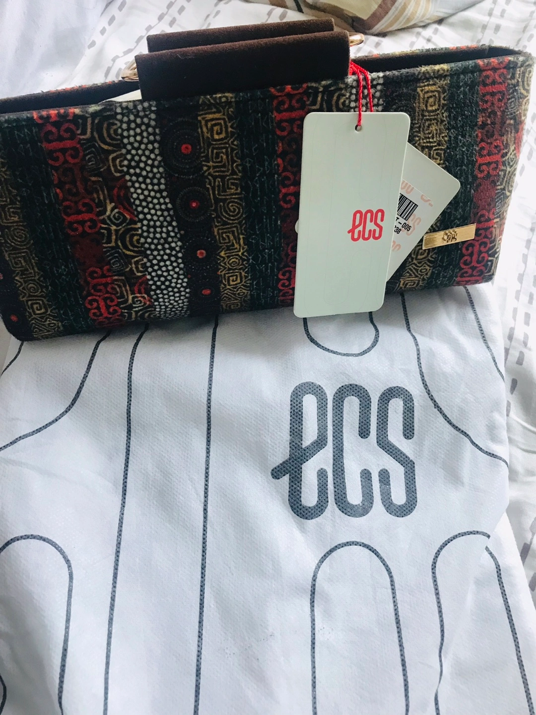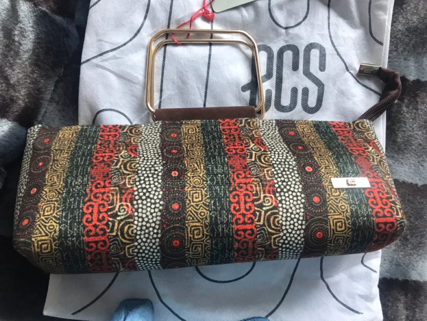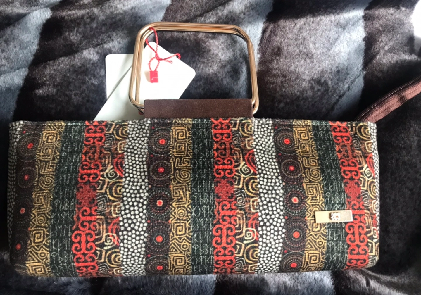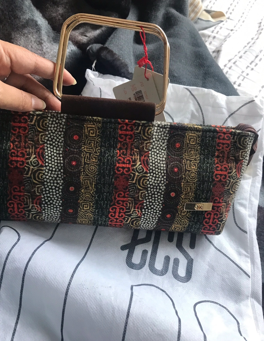 Small clutch with a gold top handle. Has a geometric print in red, black, gold, and white. Brand new, never used. Comes with dust bag. Pick up 145 Hillcrest Avenue Mississauga