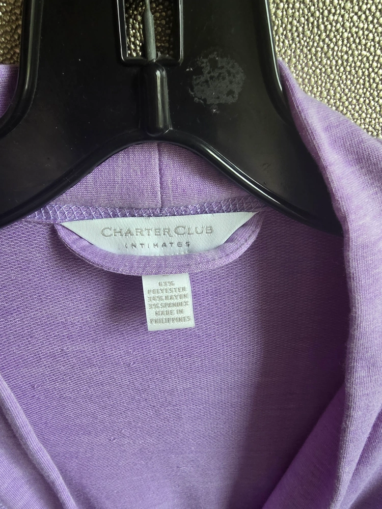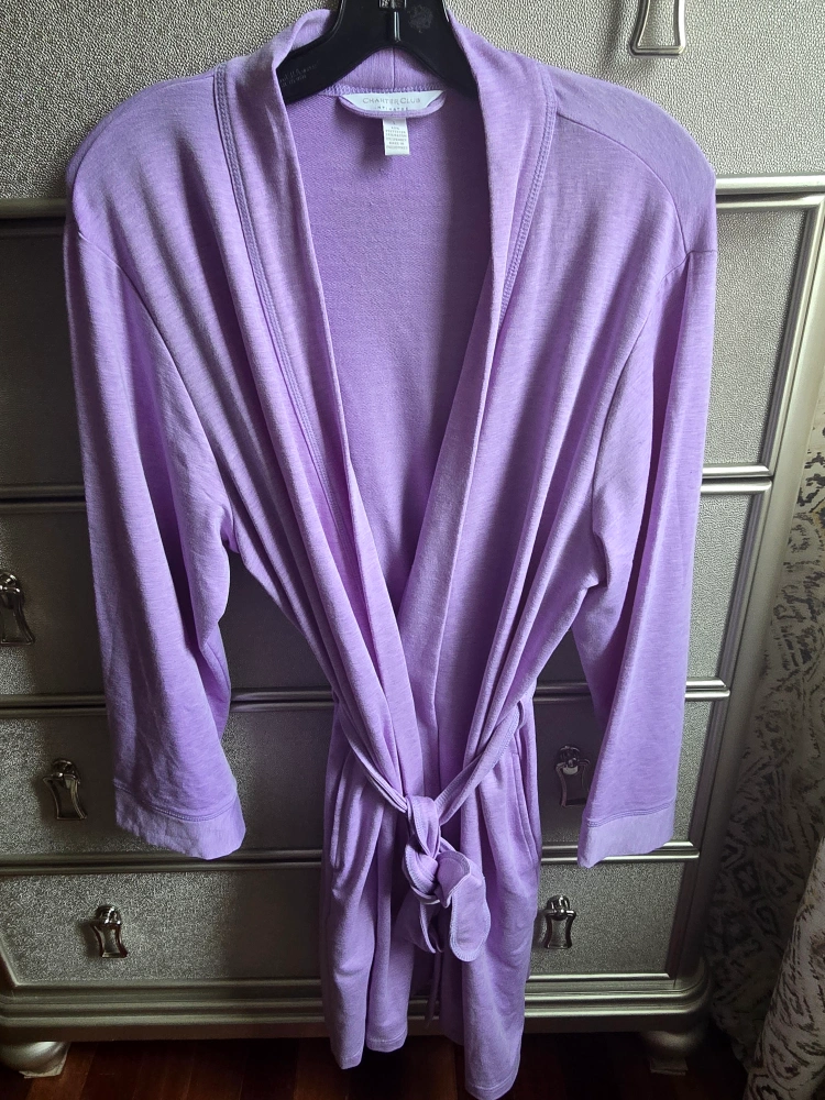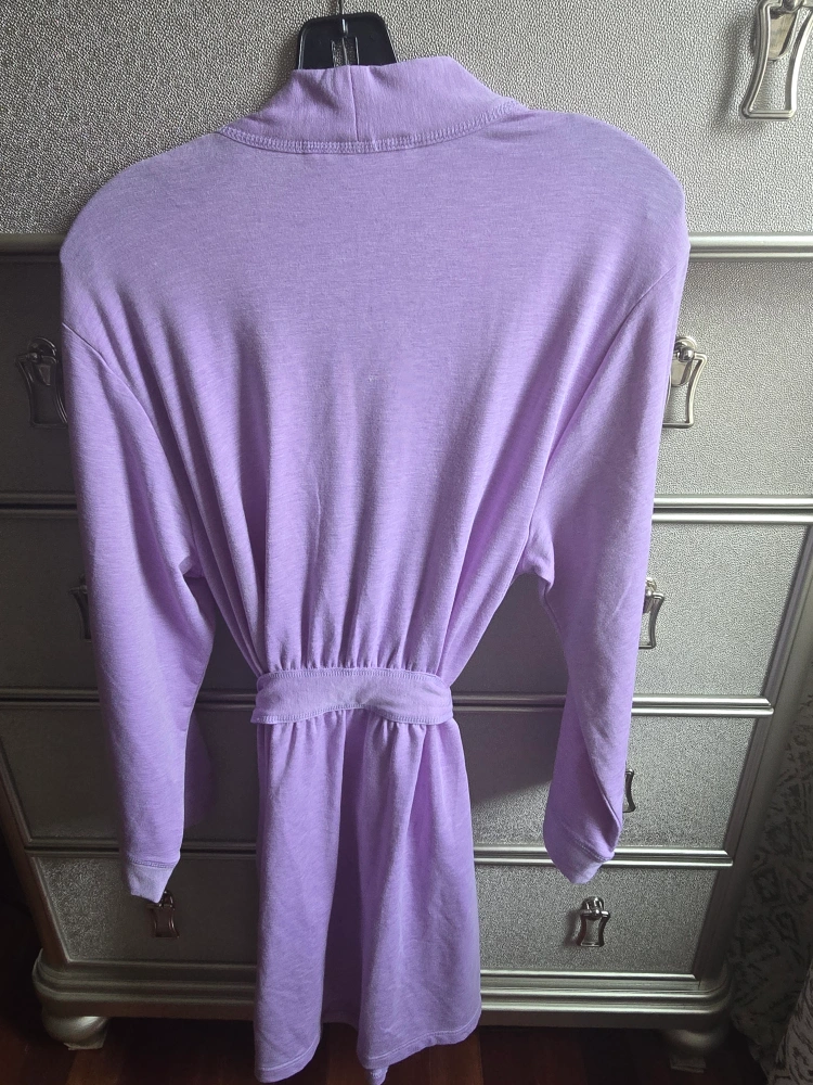 113Lilac robe with a tie waist. Long sleeves. Made in the Philippines.