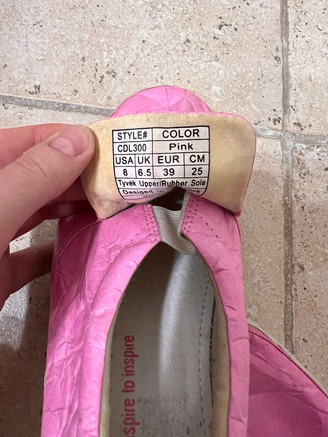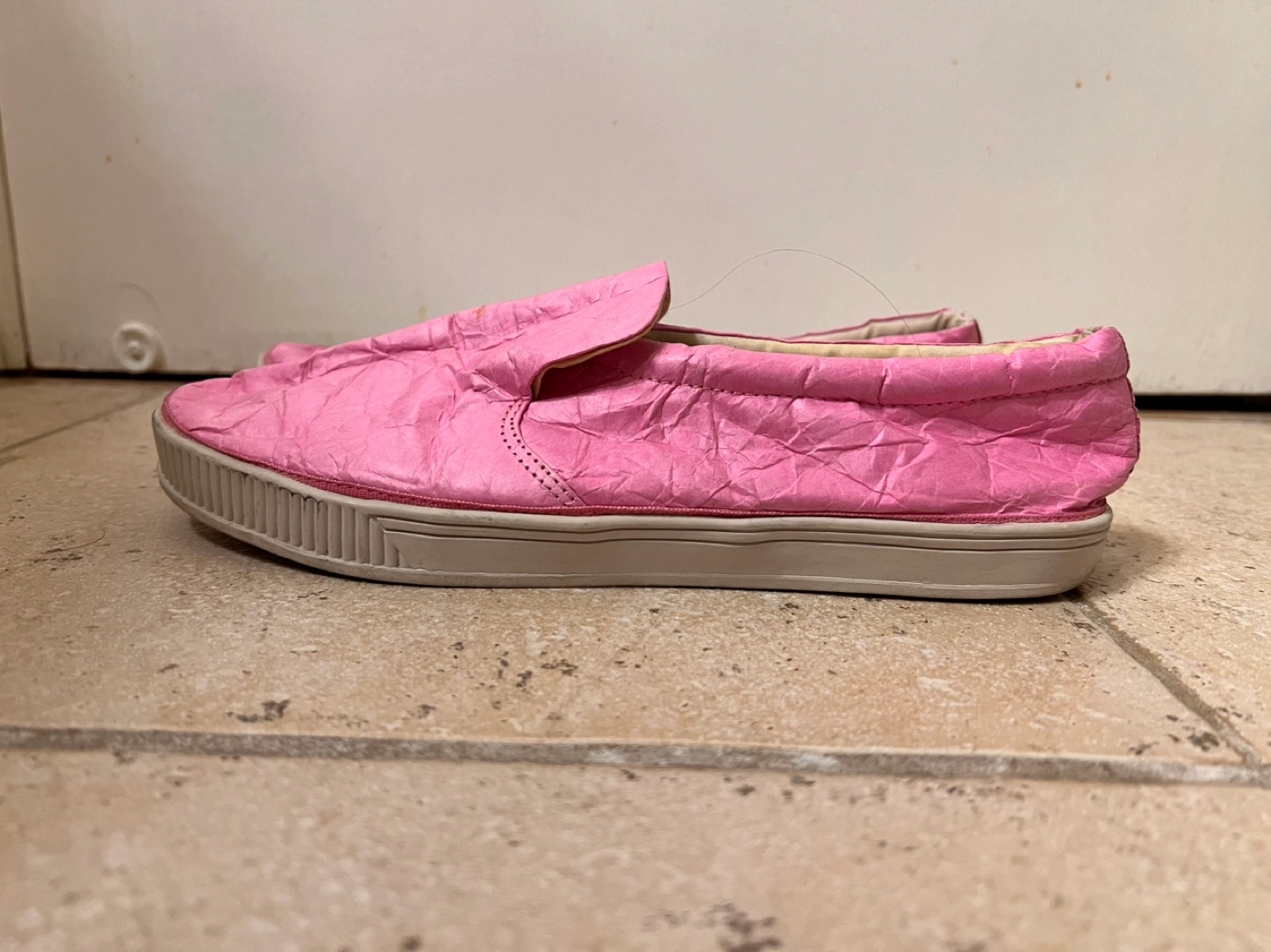 Pink slip-on sneakers with a crinkled paper-like texture. Size 8 US. Bought in Europe.