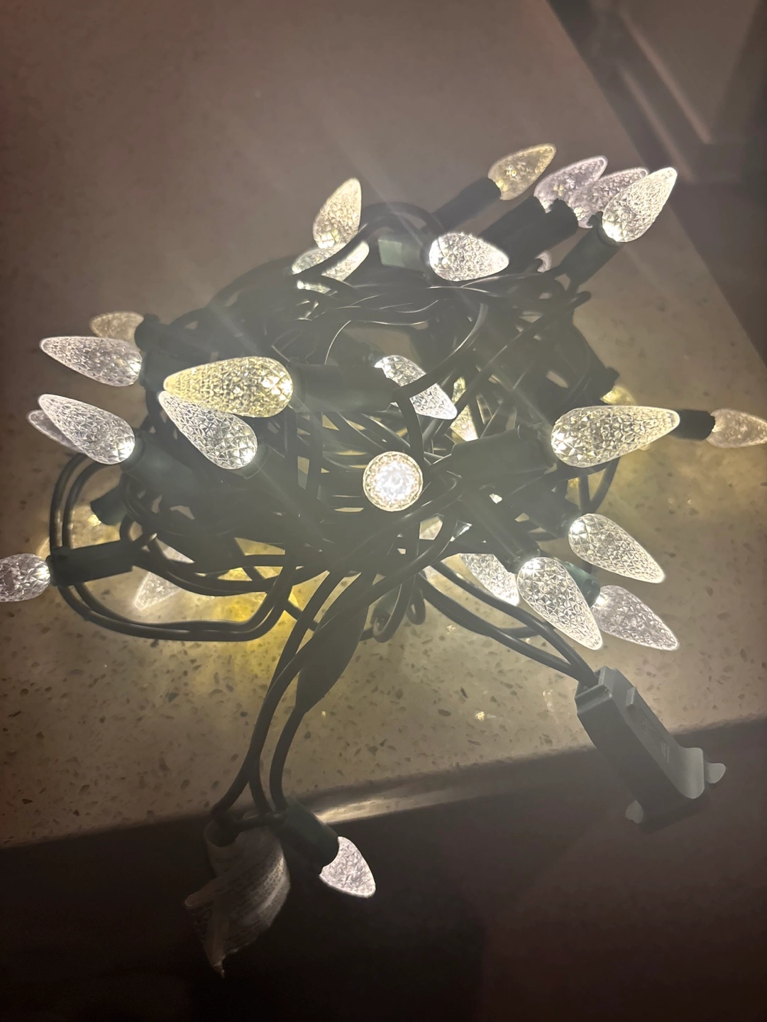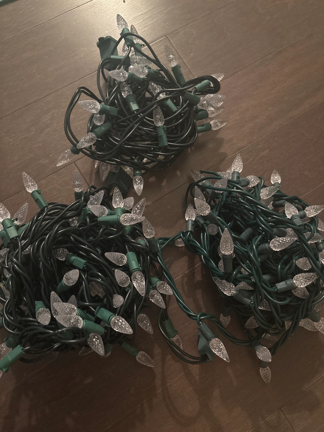 Three strings of white Christmas lights for your tree or decor for the holidays. The lights have a teardrop shape.