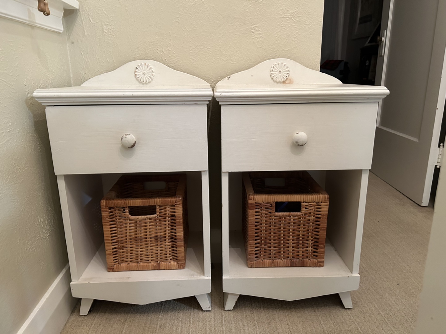 Pair of vintage white wooden nightstands. Each features a pull-out drawer and an open shelf for storage.