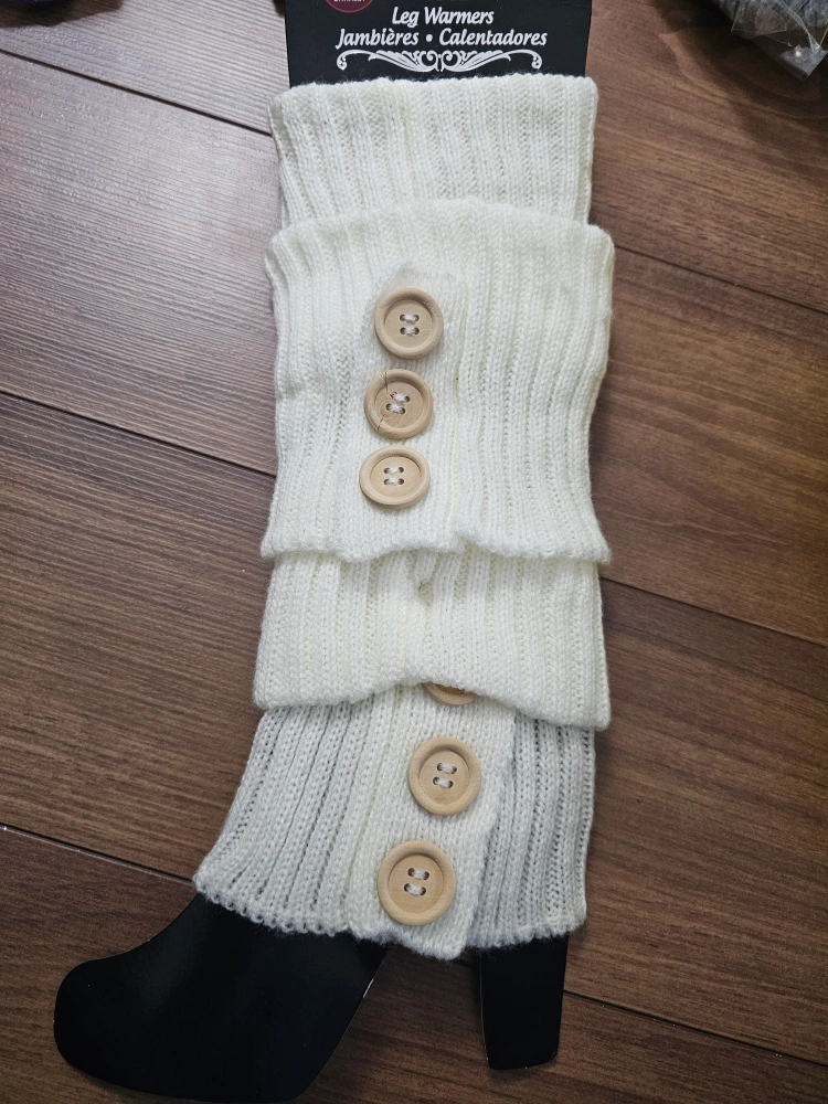 White knit leg warmers with buttons. Made of 100% acrylic. Machine washable. New with tags.