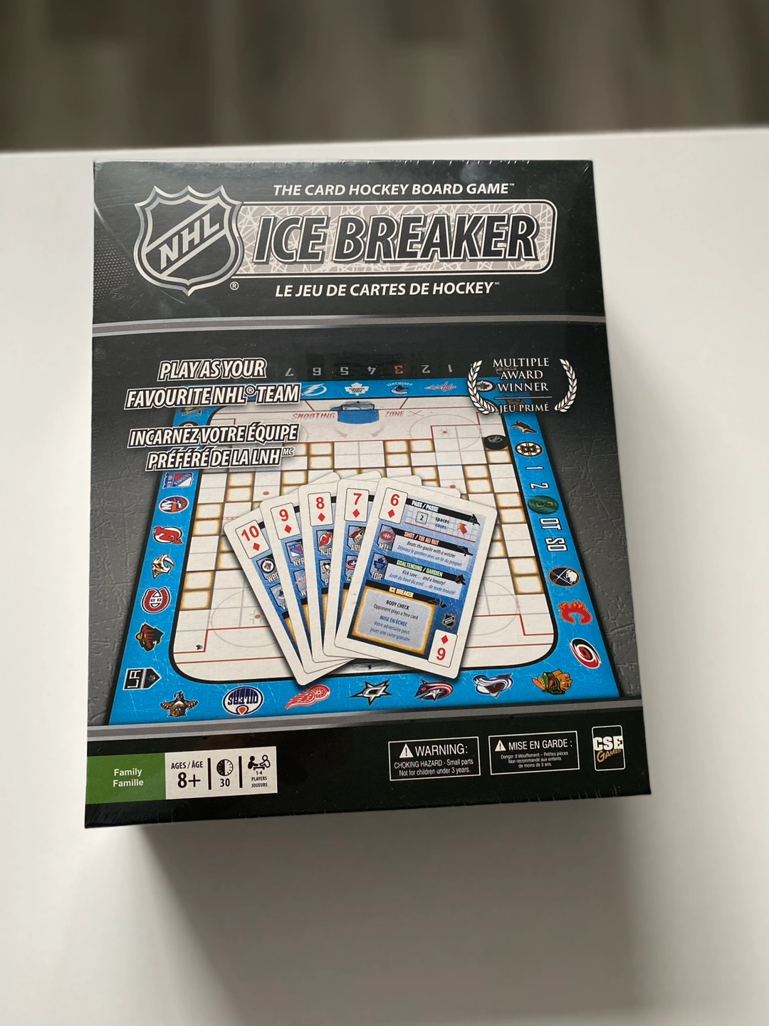 Brand new in package. The Card Hockey Board Game. Play as your favourite NHL team. Multiple award-winning game. Family game, 8+ years, 30 minutes play time, 1-4 players.