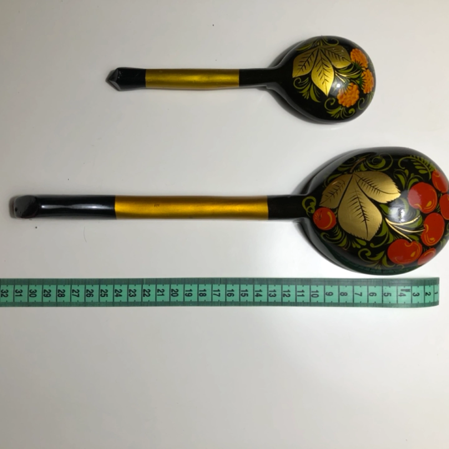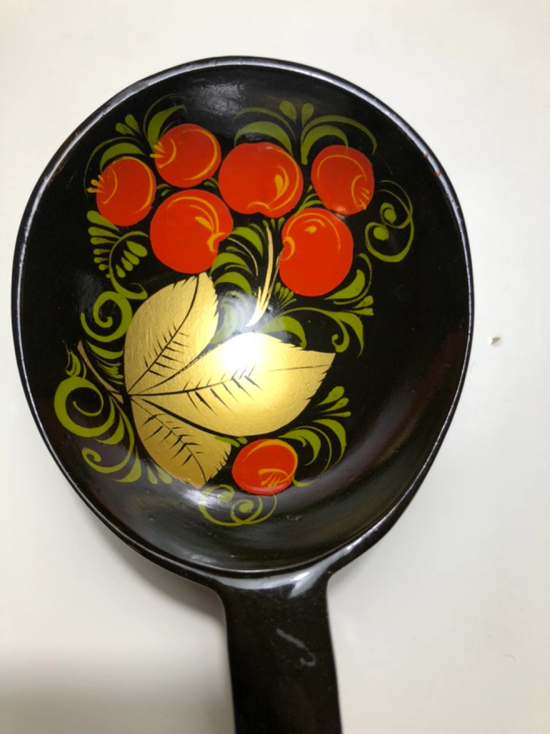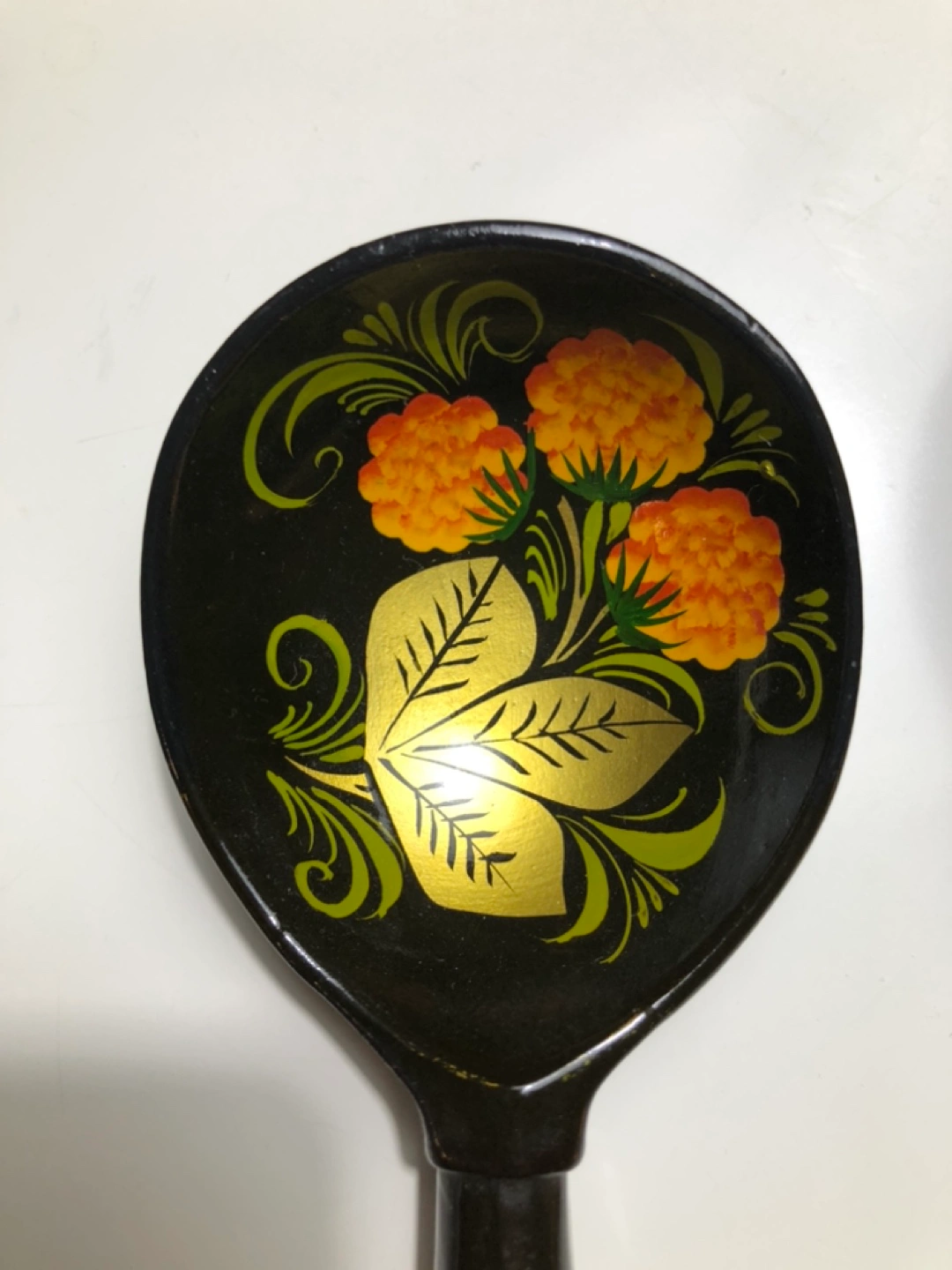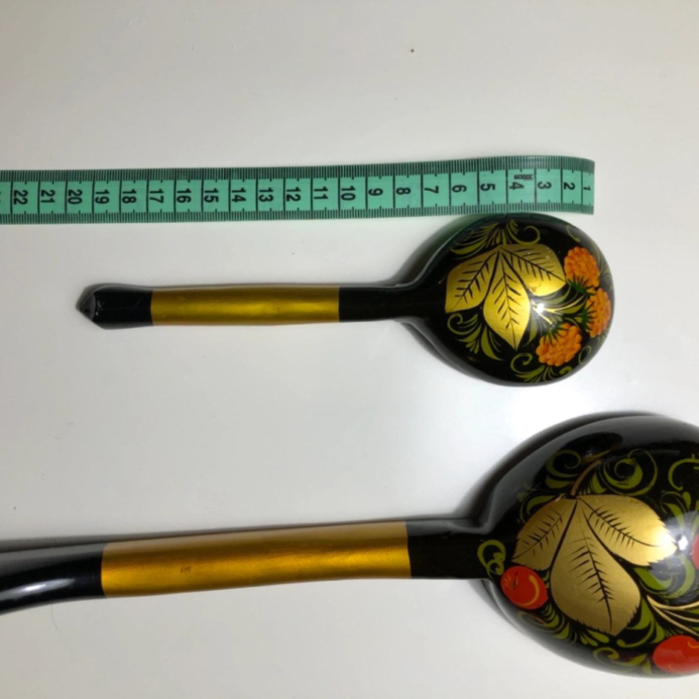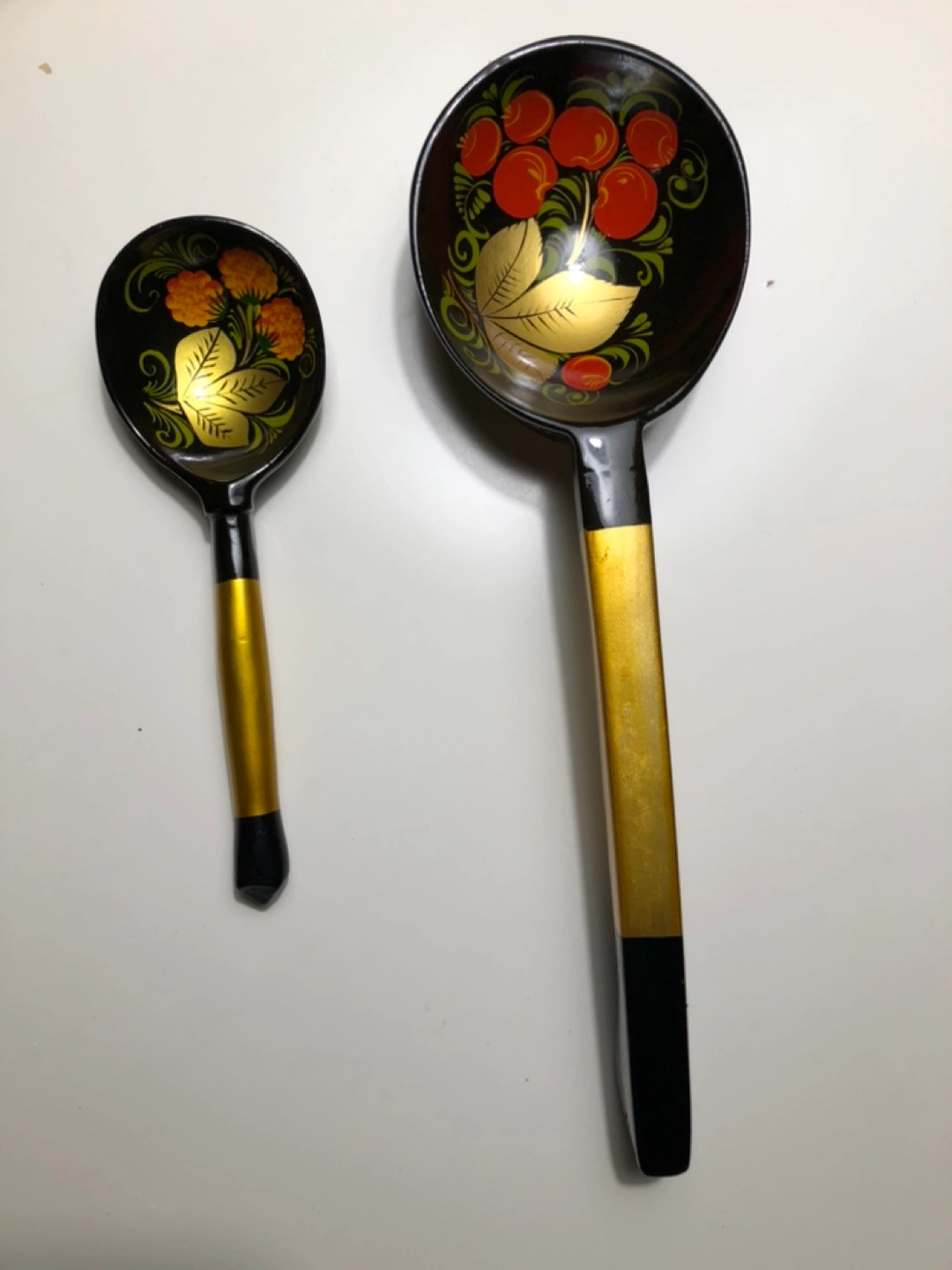 Set of two hand-painted wooden lacquer khohloma spoons. They have a black background with gold, green, and red painted designs. We’re used as display pieces; in great condition