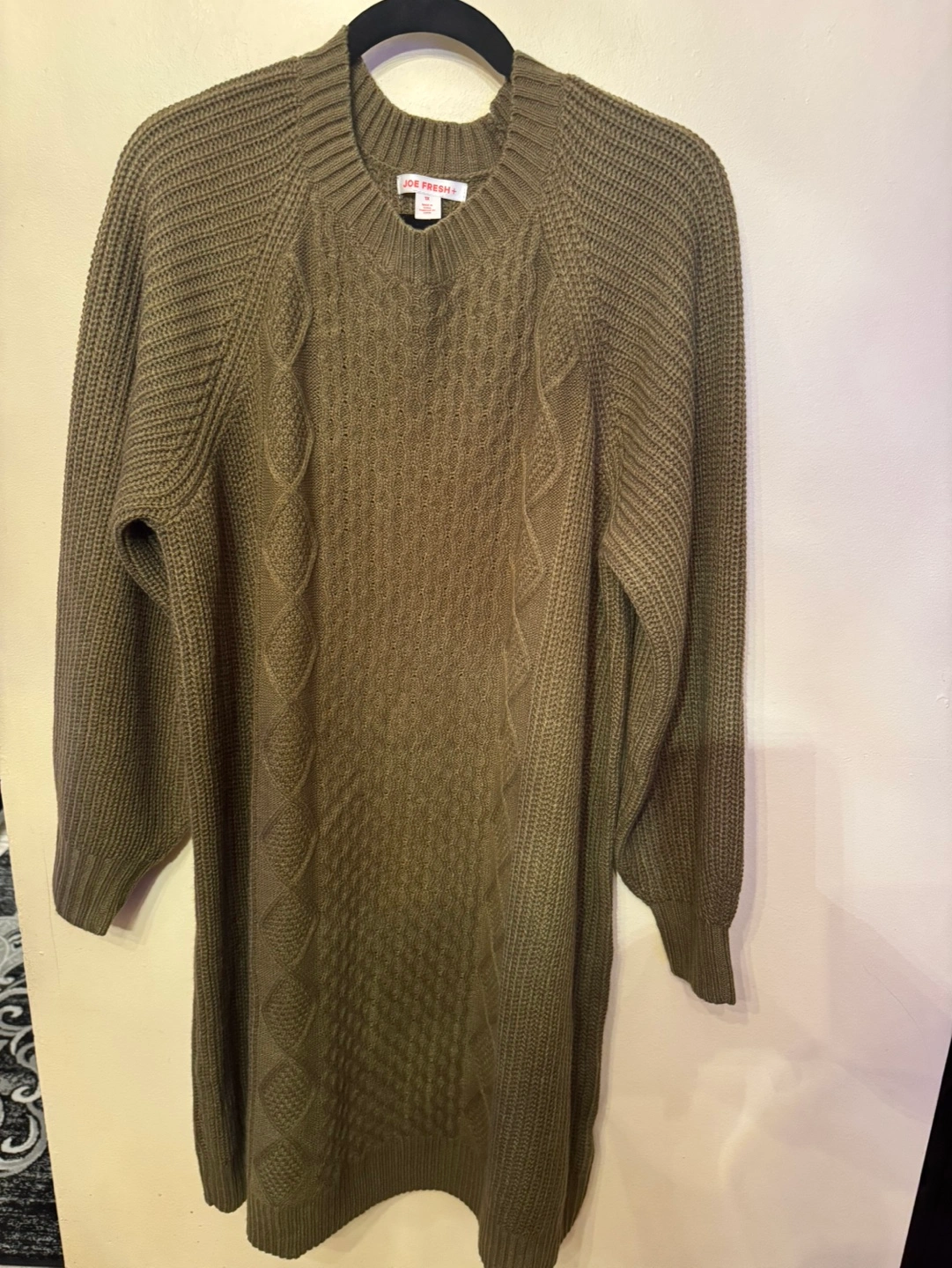 60Long sleeve green sweater dress with a cable knit pattern. Size 1X.