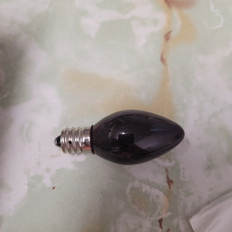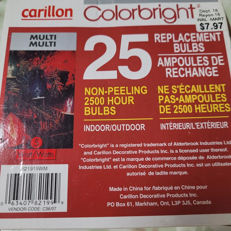 25 pack of multicoloured light bulbs. Indoor/outdoor use. Non-peeling, 2500 hour bulbs. Includes blue, orange, black, and purple.