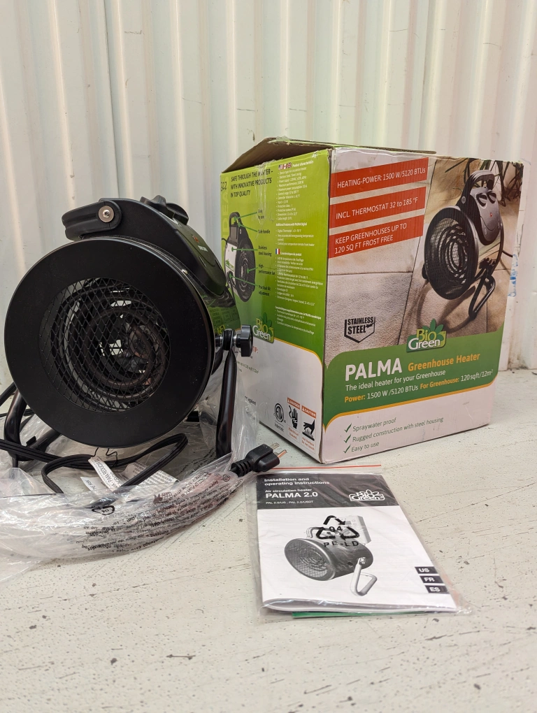 Palma Greenhouse heater. 1500W/5120 BTUs. Keeps up to 120 square feet frost-free. Spraywater proof. Rugged construction with steel housing. Easy to use.