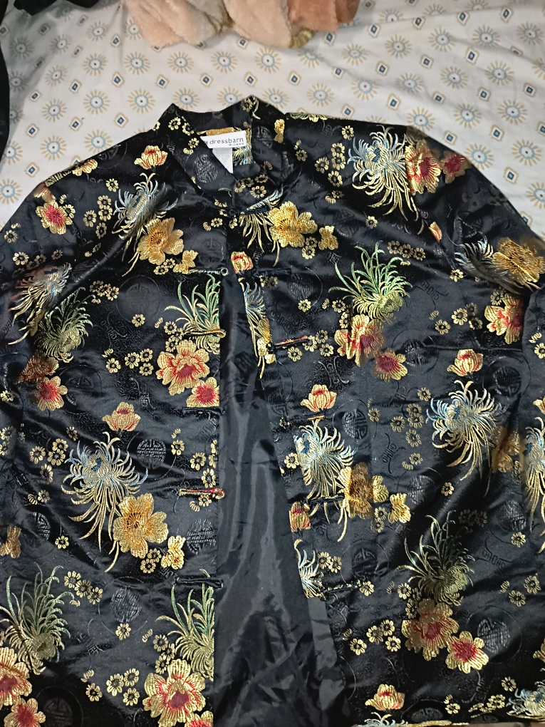 Black jacket with a floral pattern. Embroidered with gold and red thread. Button up front. Long sleeves.