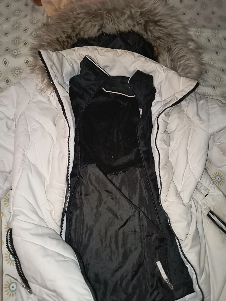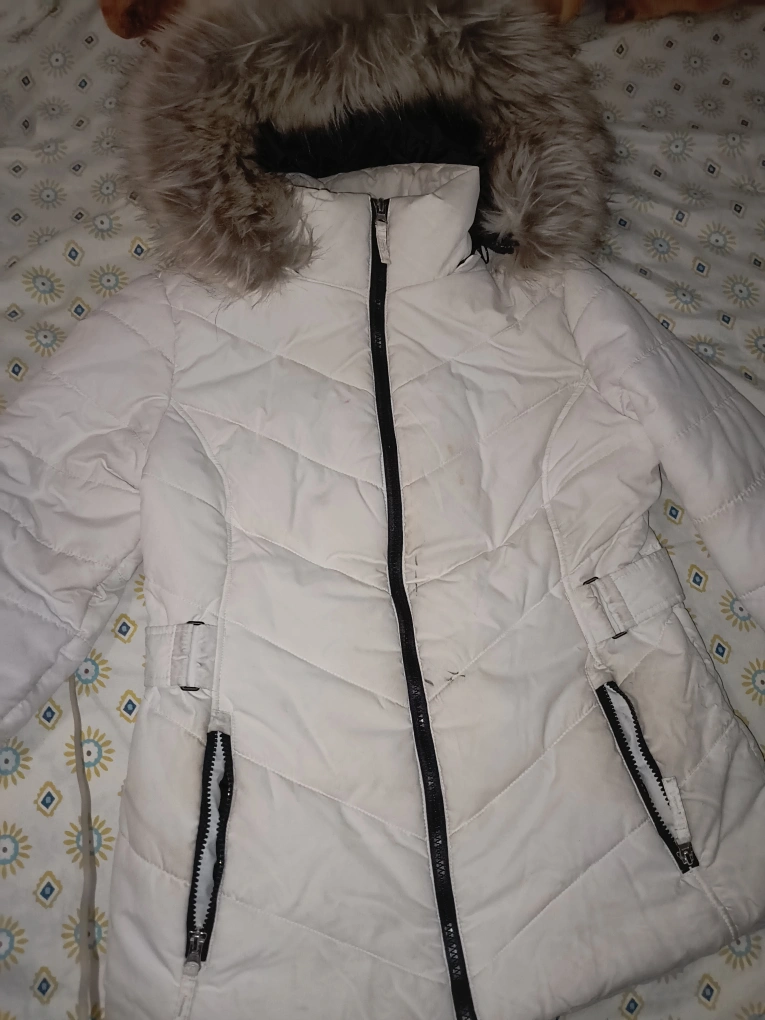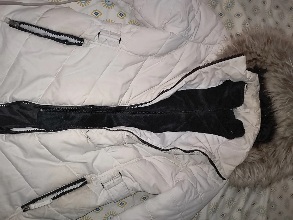 White winter coat with faux fur trim on the hood. Long sleeves, zipper closure, two side pockets and a belt.