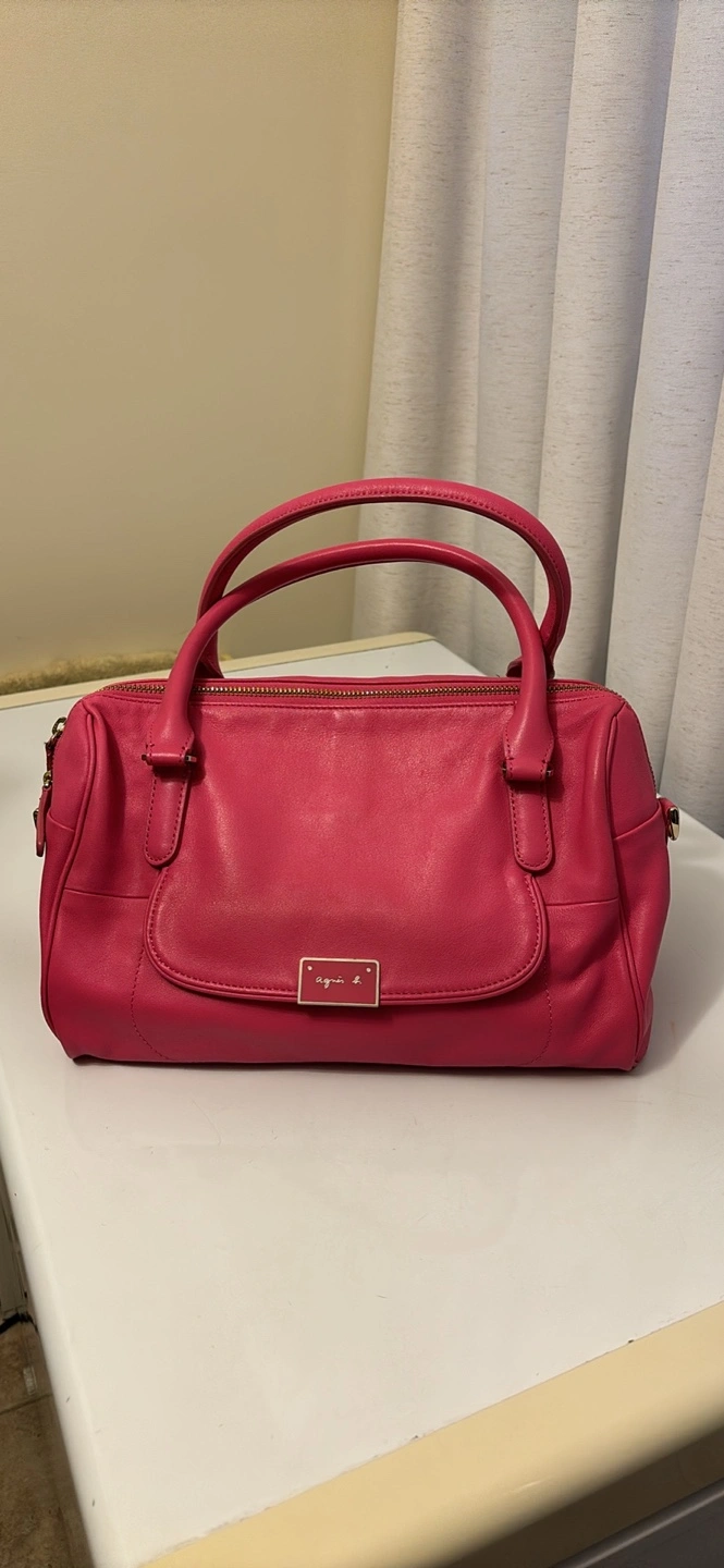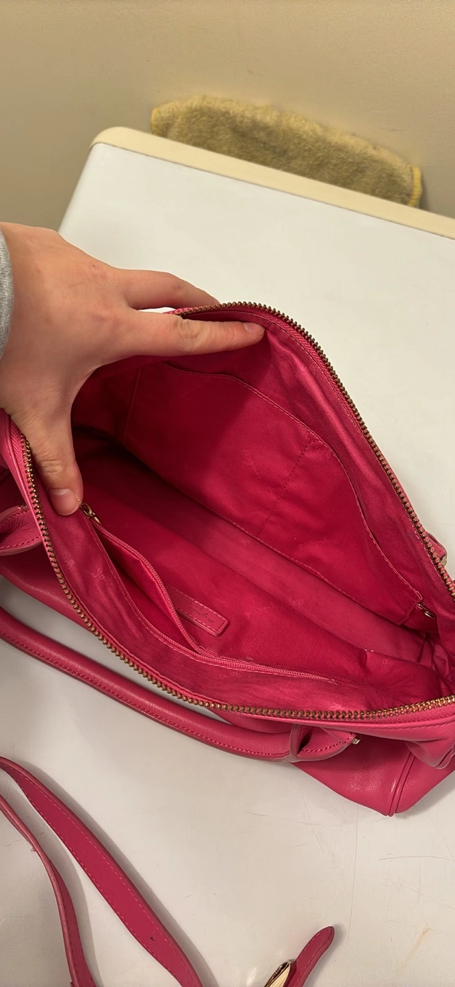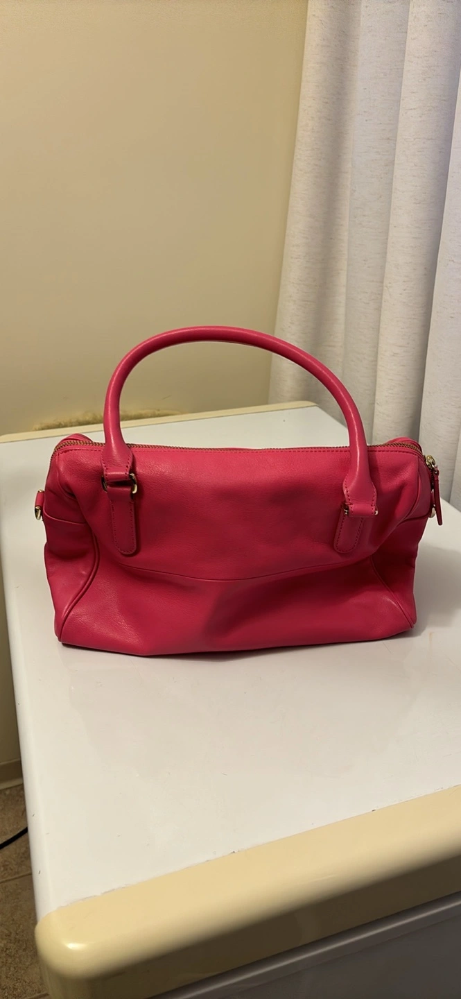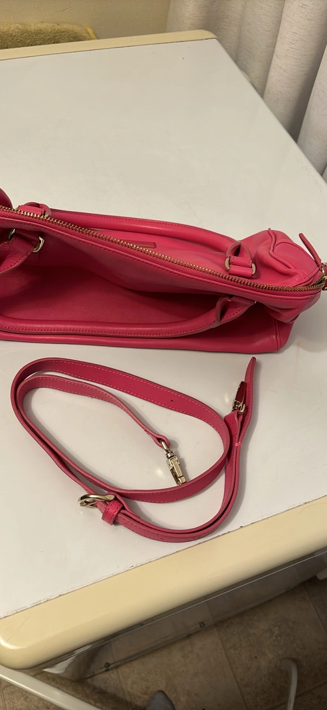 Pink leather handbag with a gold zipper. Features an adjustable shoulder strap and two top handles. It has one internal zippered pocket and two open pockets.
