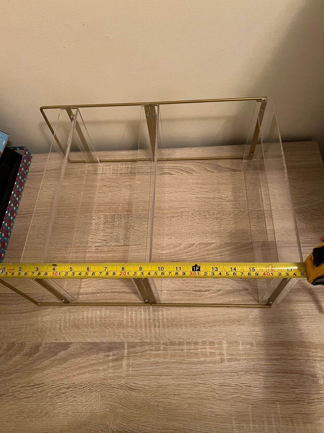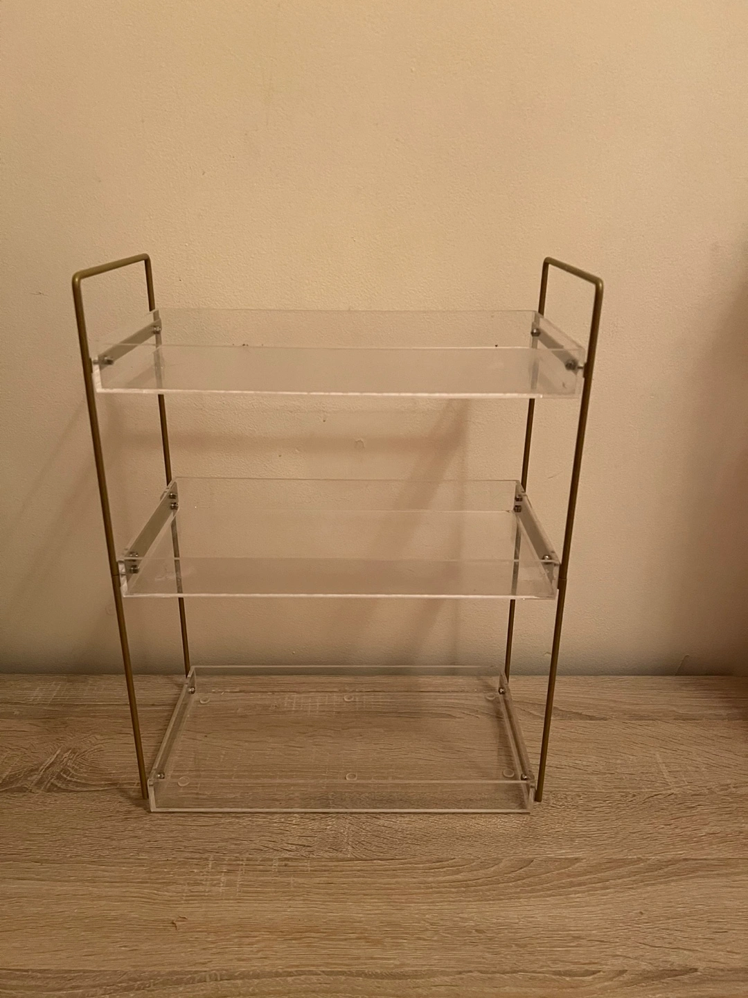 Clear acrylic shelf with gold metal frame. Three shelves. Perfect for organizing items in your bathroom, bedroom, or kitchen.