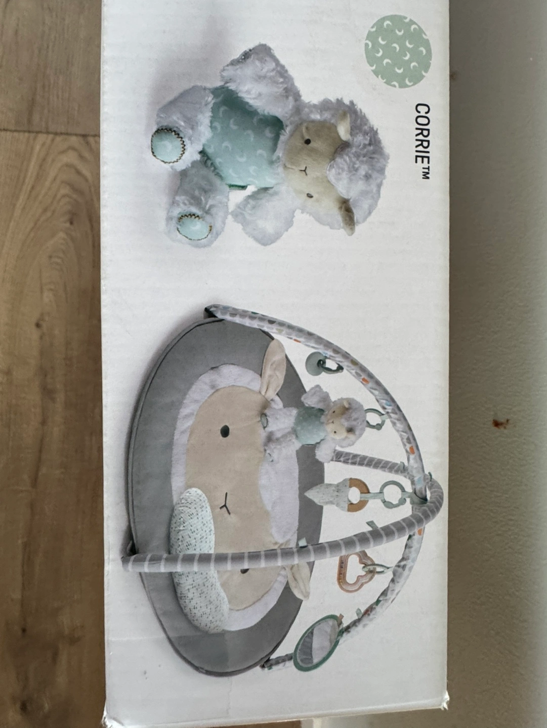 Plush activity gym with a soft, padded play mat. Features a removable arch with hanging toys, a soft sheep toy, and a crinkle pillow.