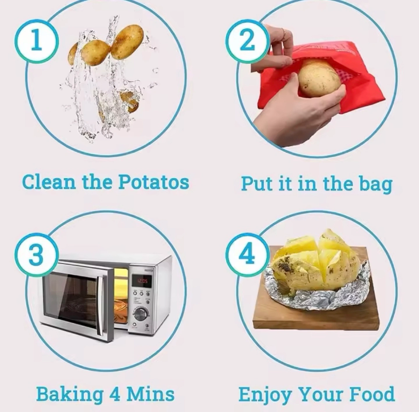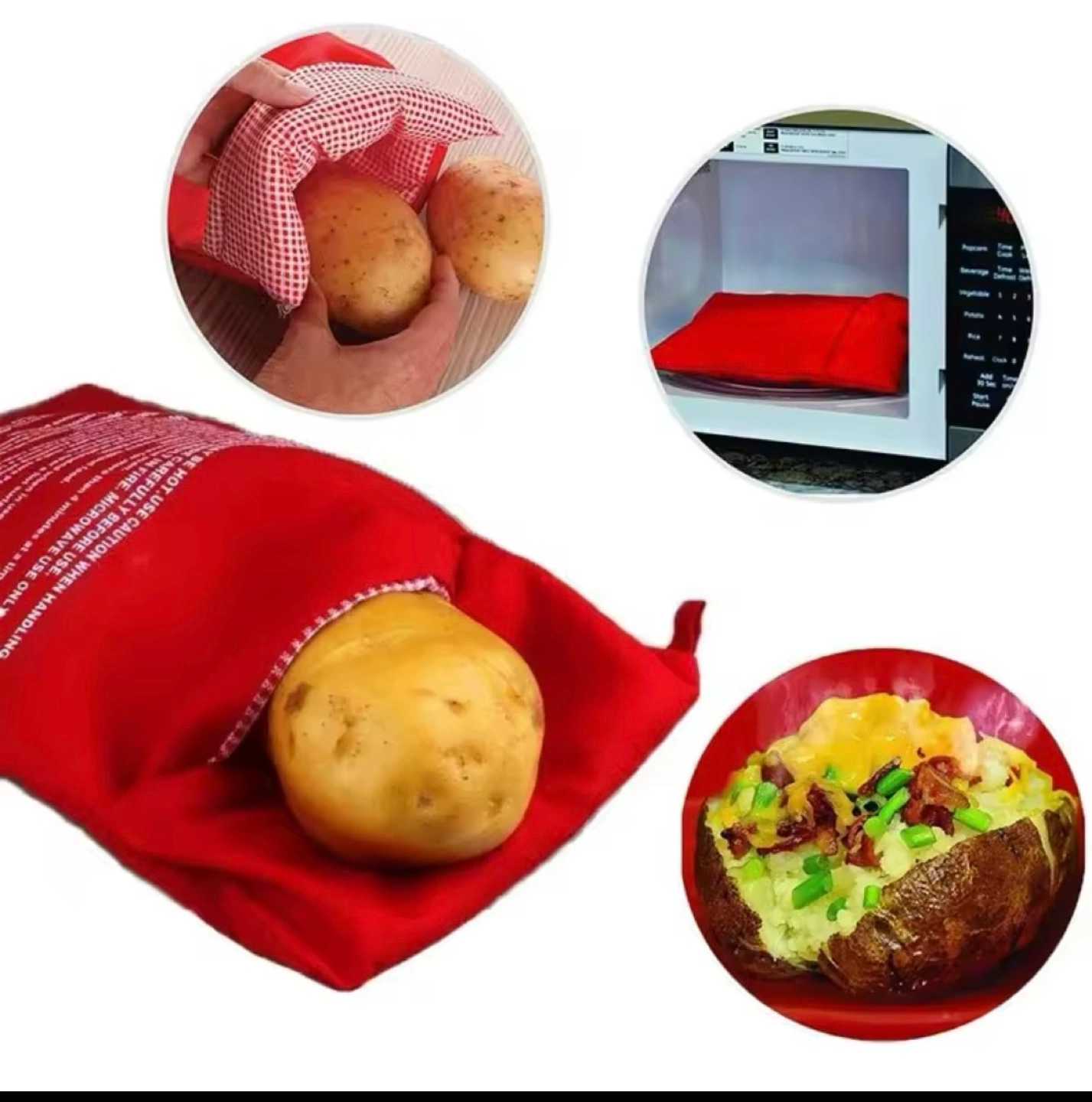 Set of 3 microwave potato bags. Great for baking potatoes, sweet potatoes, corn and more. Durable and reusable.