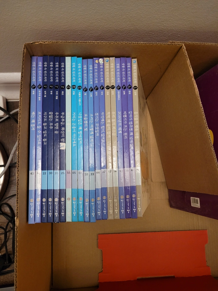 Set of 25 Korean Language Textbooks. All books are in Korean, likely for students. Some books have numbers on the spine. Includes one textbook from Nelson Mathematics Grade 8.