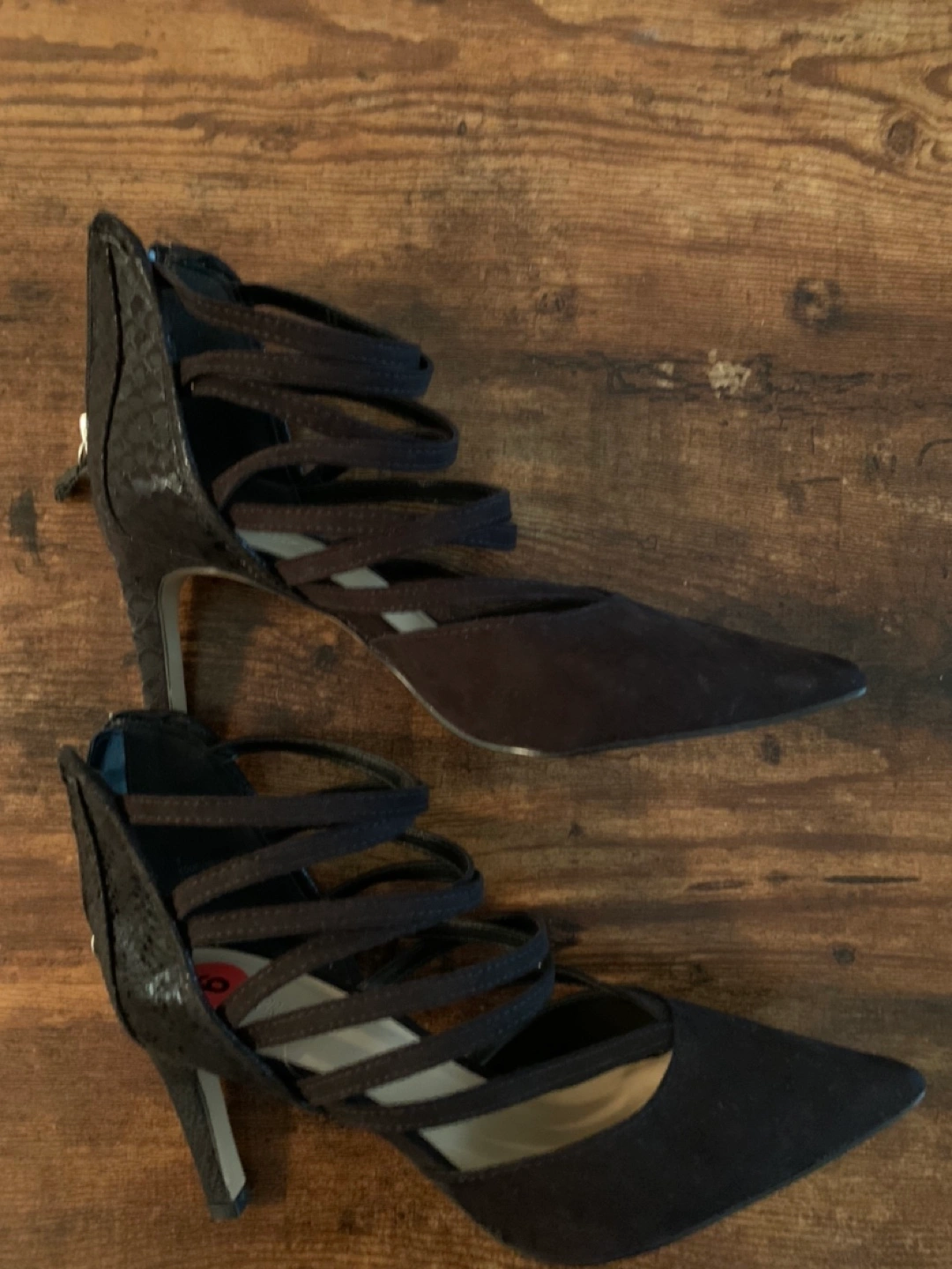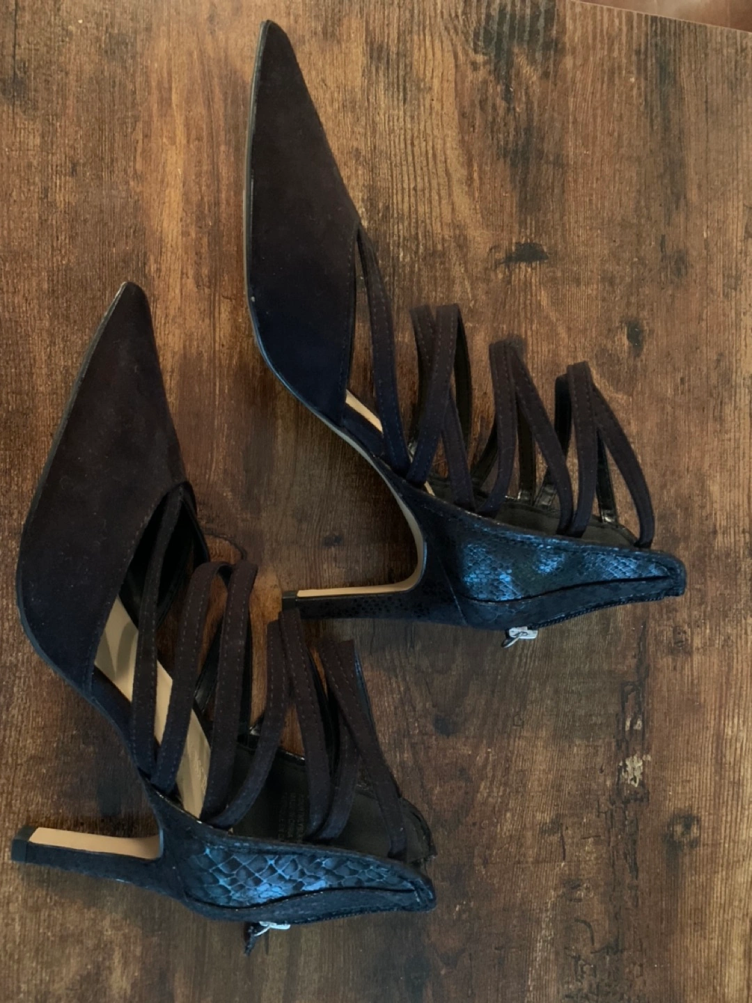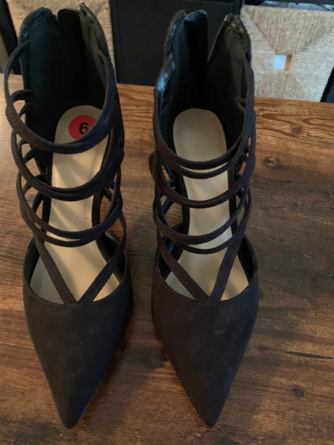 Great for work or formal attire, size 36 - never worn (size tag still on it) heels with straps and zipper in back. Suede material. Brand: expression)