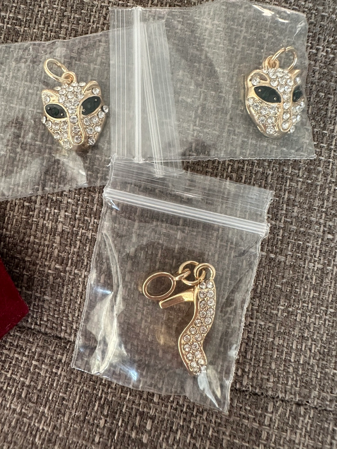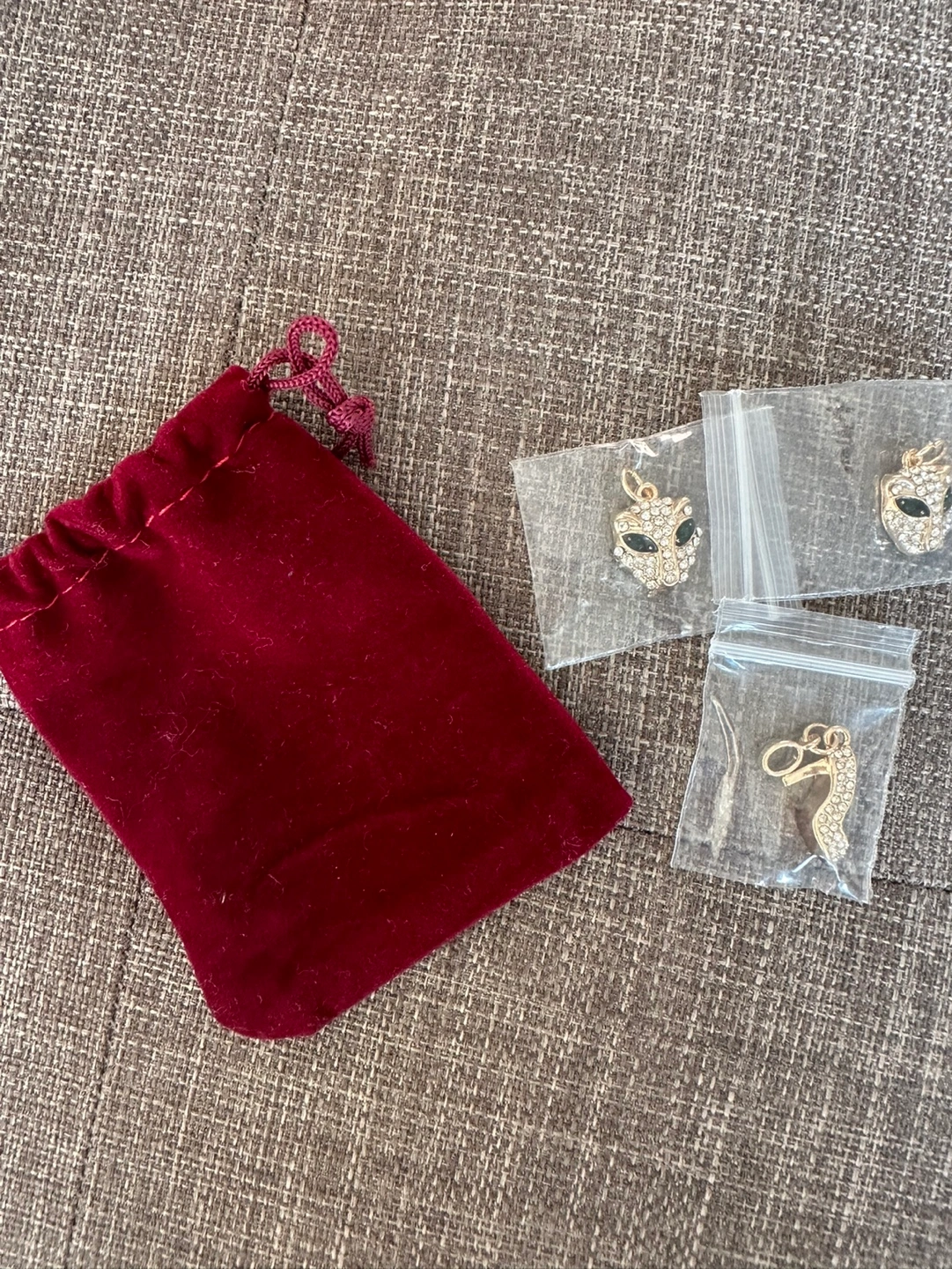 Two gold tone charms with rhinestones in the shape of a cat. One gold tone charm with rhinestones in the shape of a high heel shoe. Comes with a red velvet pouch. Pickup at📍Bathurst/Fort York