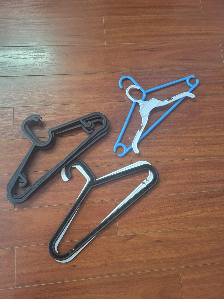 Set of 4 plastic hangers. 3 black hangers and 1 blue hanger. Great for organizing closets or hanging clothes.