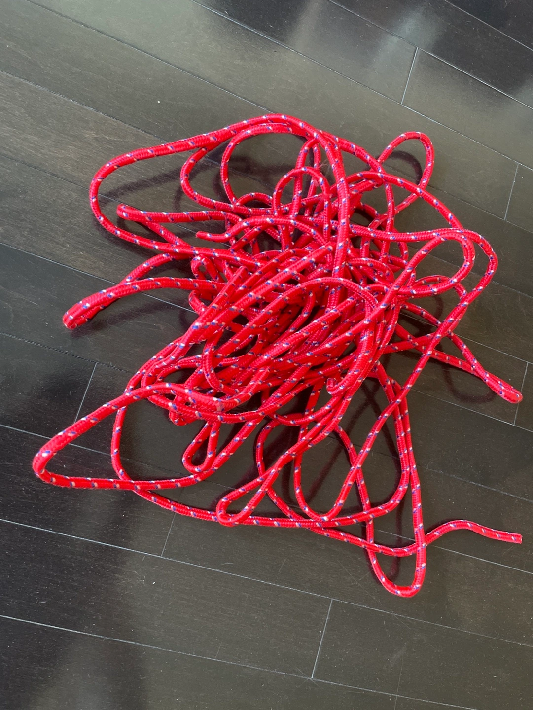 Red rope with blue accents. Good for crafts, DIY projects, or tying things up.