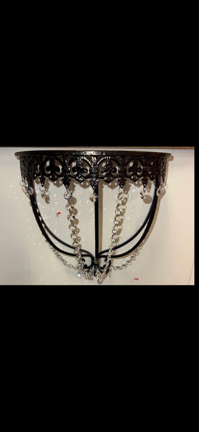 Black metal wall shelf with crystal accents. Features a lattice design shelf with decorative trim.High 15 inch,wide 13 inch