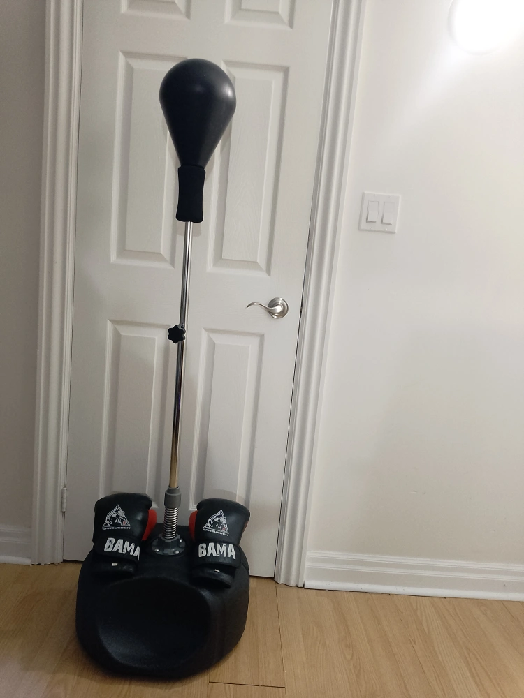This set is like new. The boxing stand is vertically adjustable and weighed down by water or sand. Comes with a large size set of gloves. Comes from a pet free and smoke free home. Both have been washed cleaned and sanitized. Get ready to be fit and healthy for the new year!