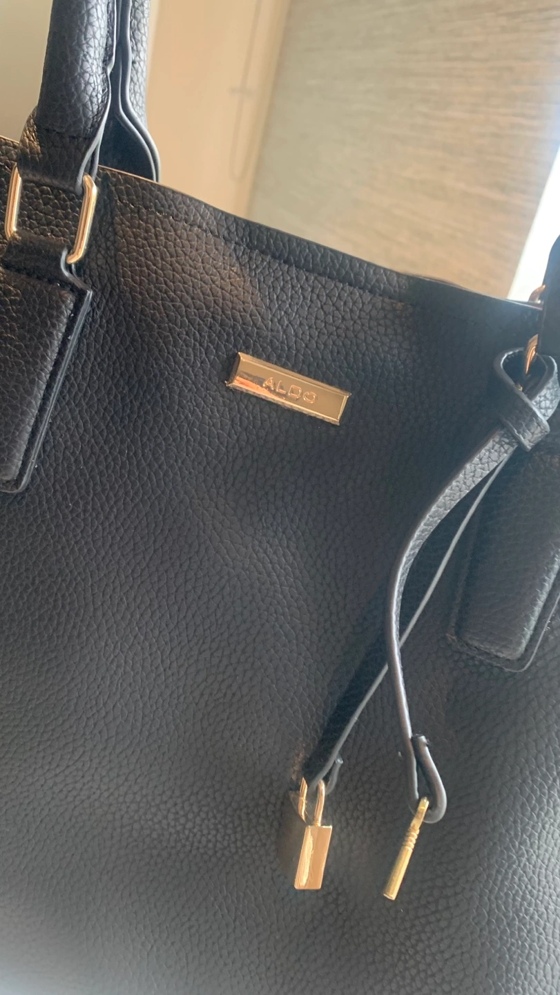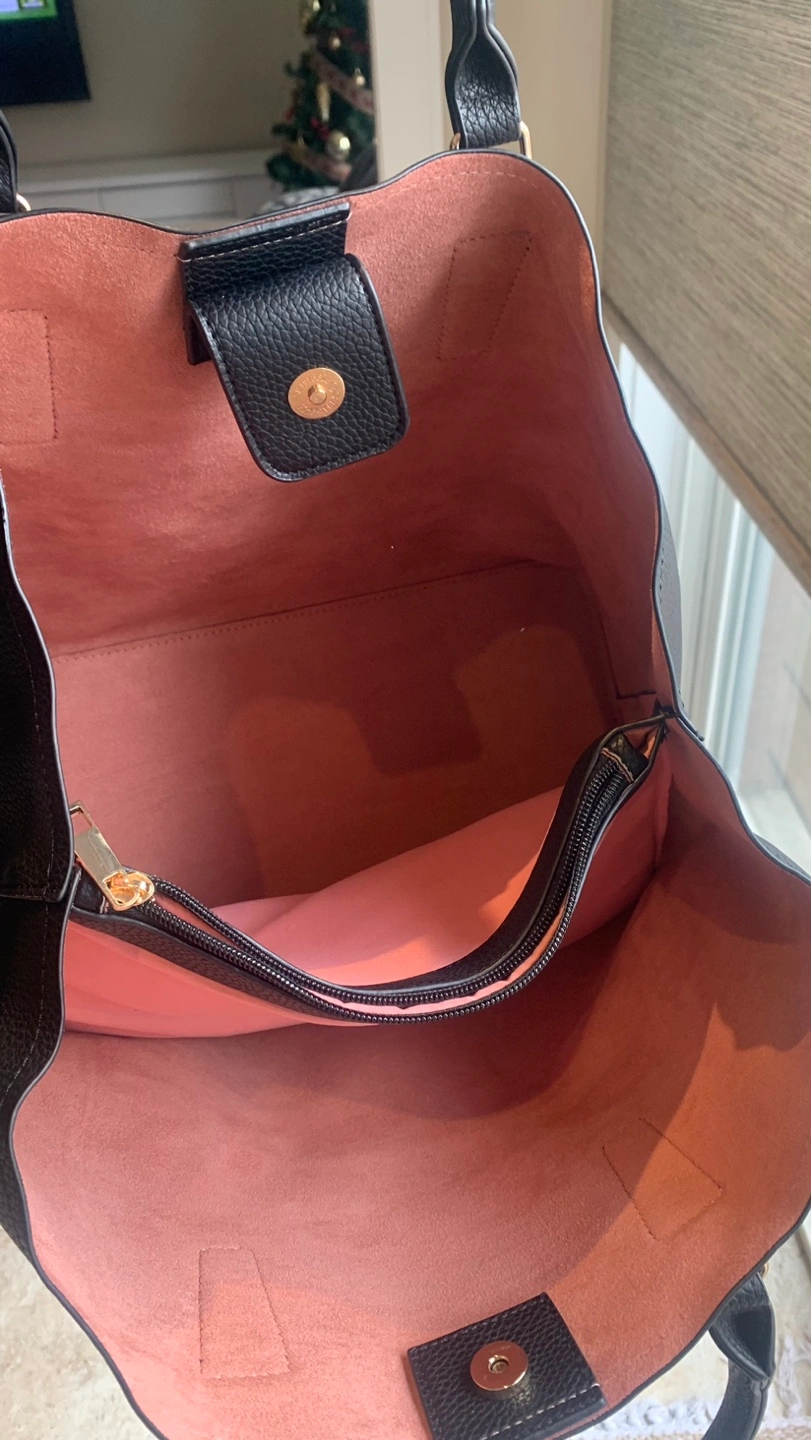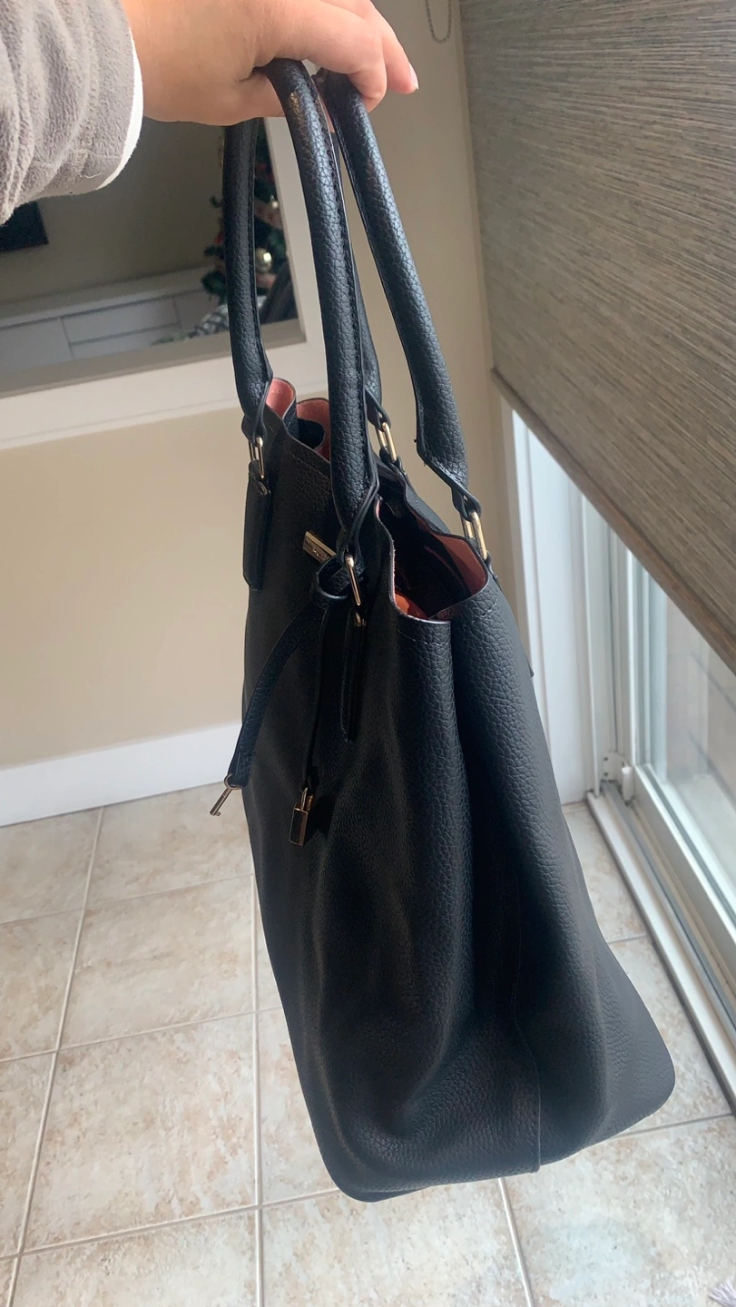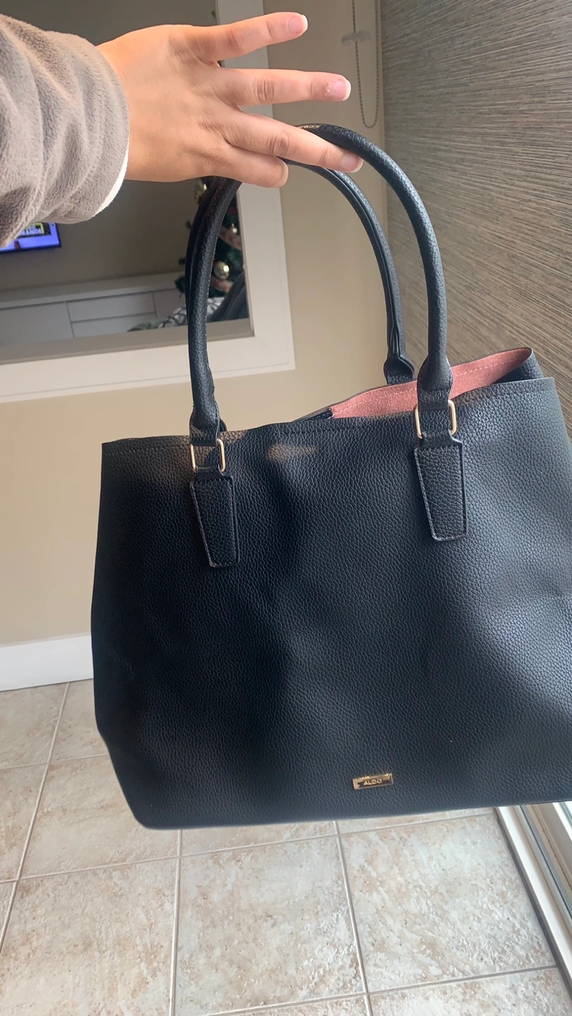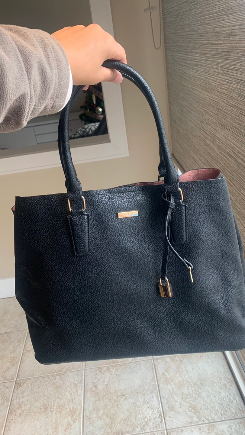 Black tote bag with gold hardware and pink lining. Two top handles, one zippered pocket on the inside and one open pocket.
