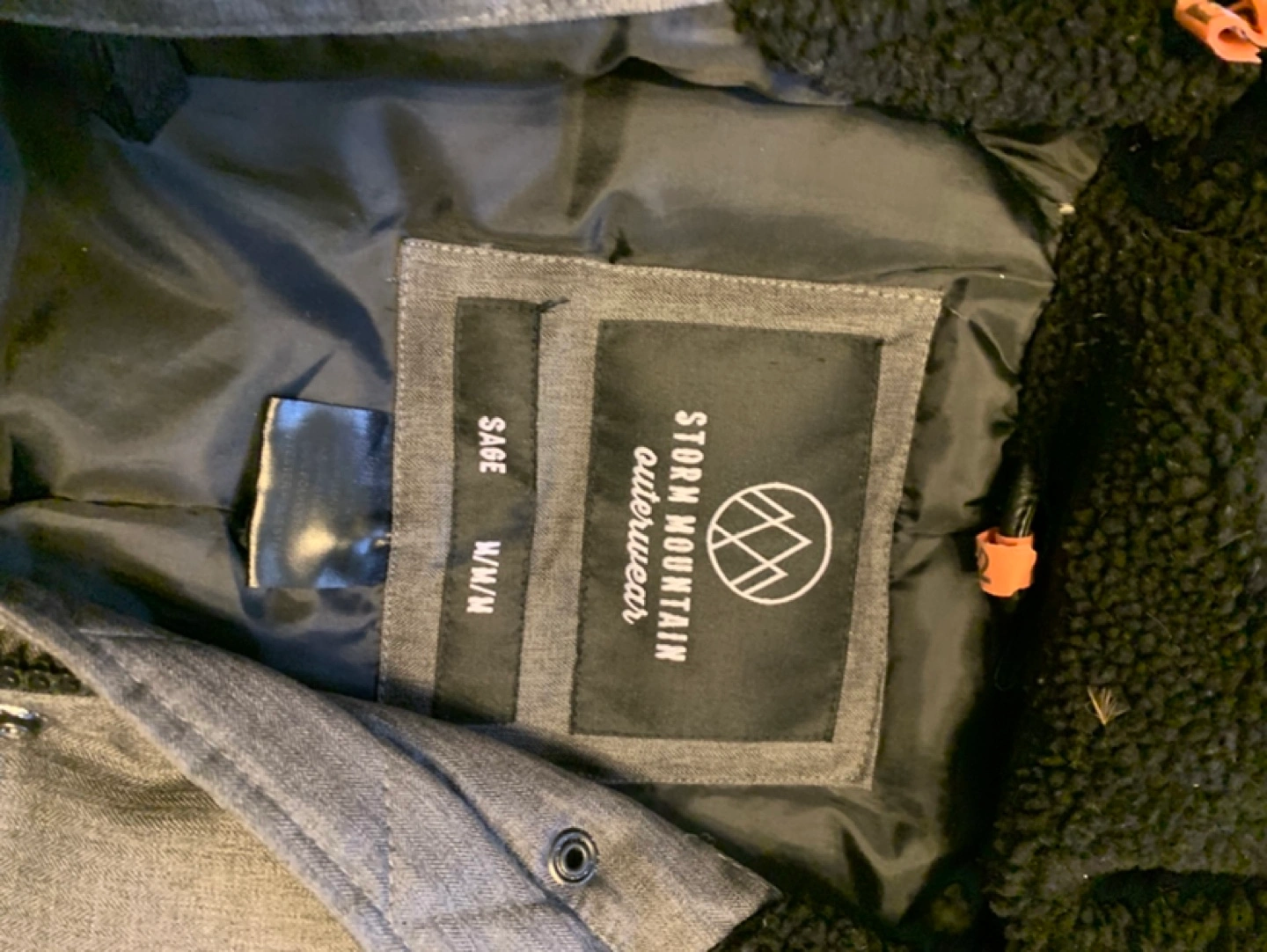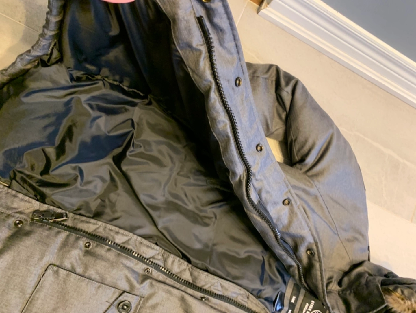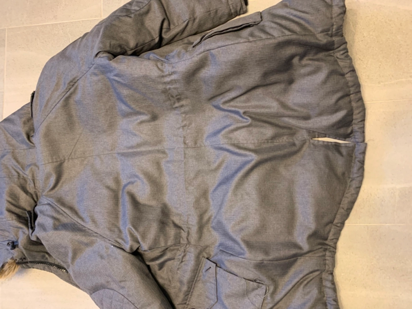 Grey parka with fur-lined hood. Has two front pockets, one on the sleeve, and one inside. Zipper and button closure.
