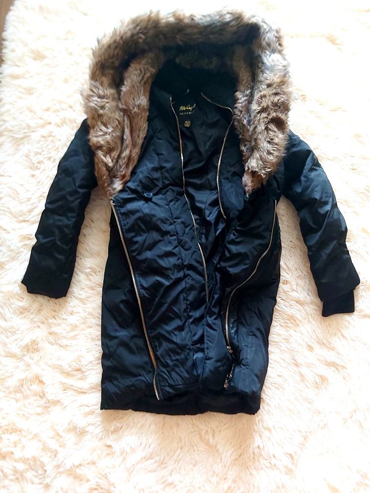 NEVER WORN! Black puffer jacket with a faux fur hood and a belt. Gold coloured zippers. says XS but can fit up to Size medium. very large jacket. has double zipper extremely warm! selling because I drive mostly. no need for heavy jacket.