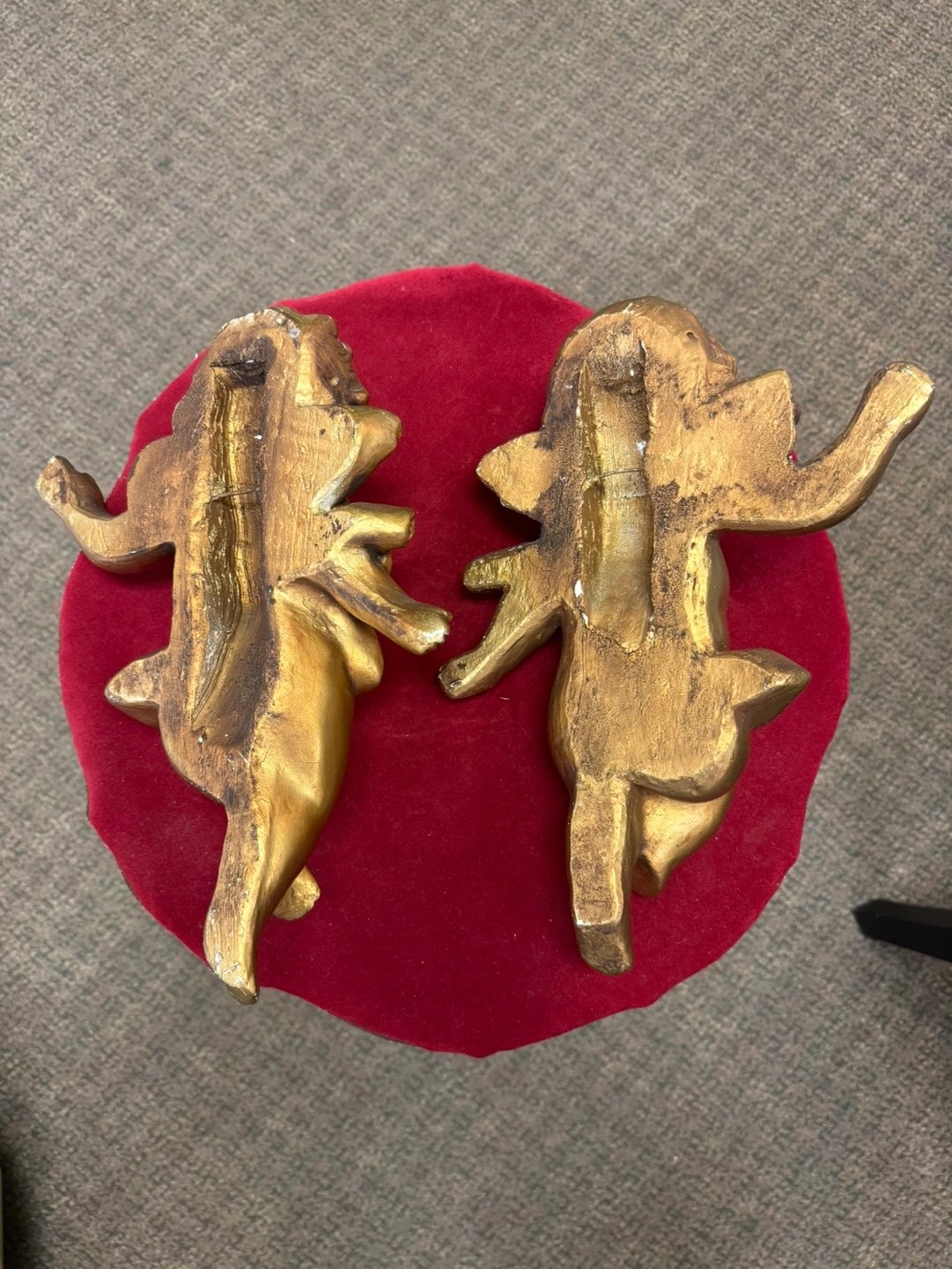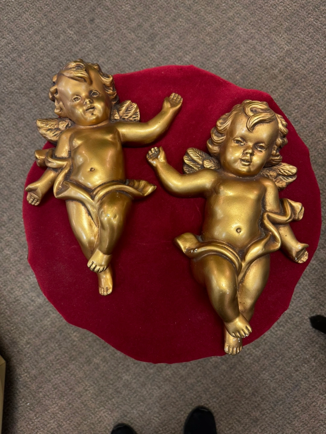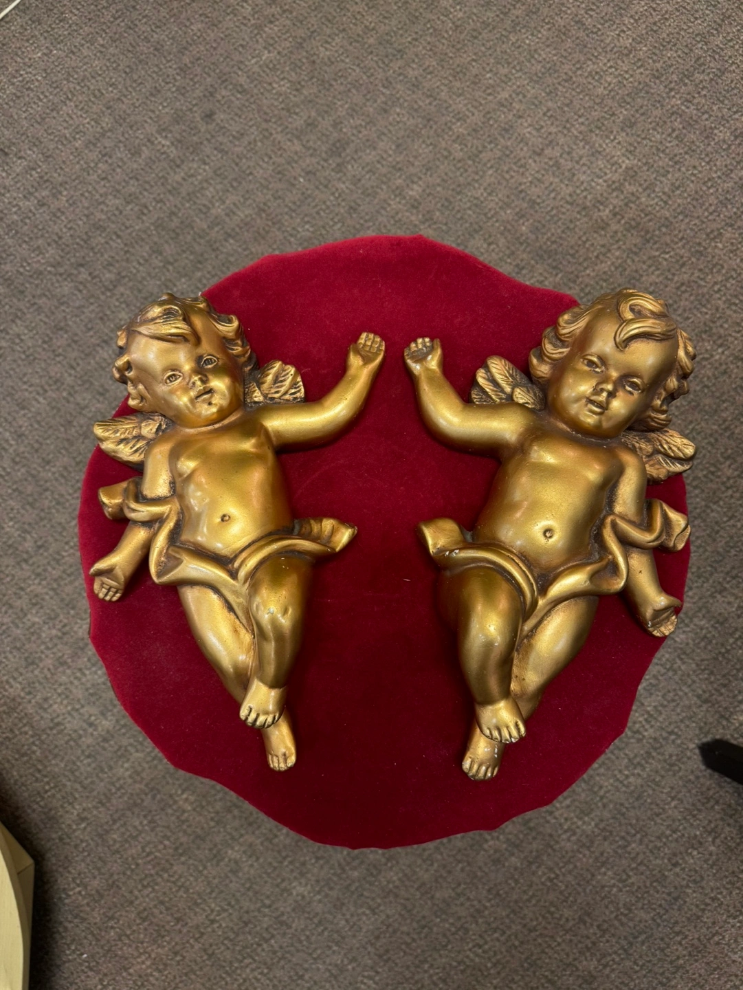 60Pair of gold cherub angel figurines. Both have wings and a ribbon around their waist. They are both in good condition.High 13 inches