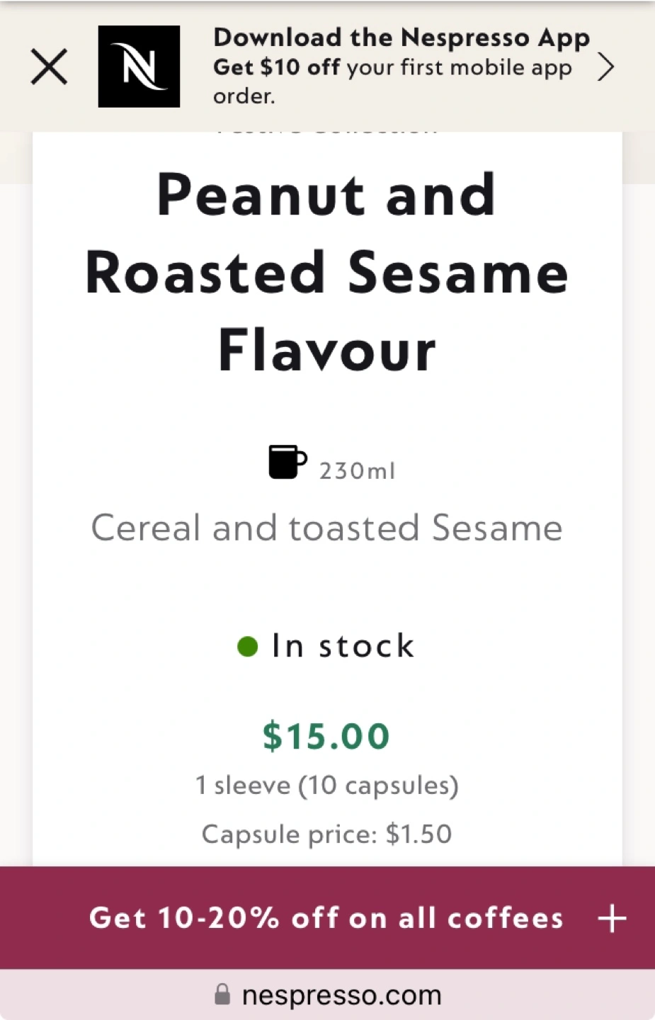 10 capsules of Nespresso Vertuo Peanut and Roasted Sesame Flavour coffee. Brand new, unopened box.