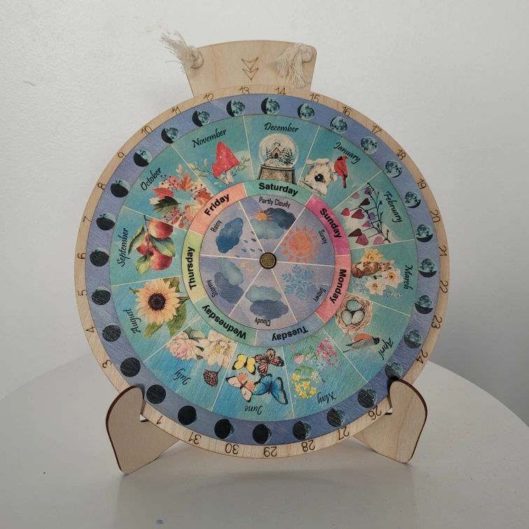 Wooden calendar with moon phases, and weather illustrations. Months of the year are labelled along the edge. Days of the week are also labelled. Handmade in BC.