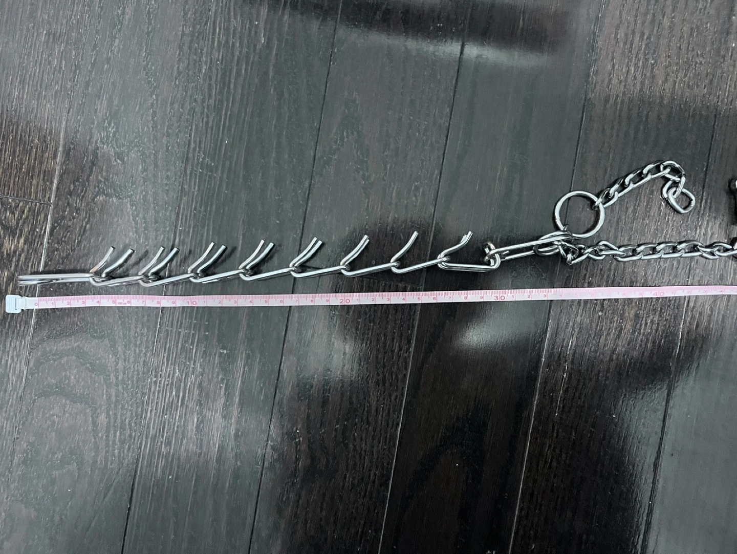 Metal prong collar. Has a safety clasp. Approximately 21 inches long. Links measure approx 0.8-1 inch. Some colour fading otherwise no defects. Easy on/off. For a medium sized dog.