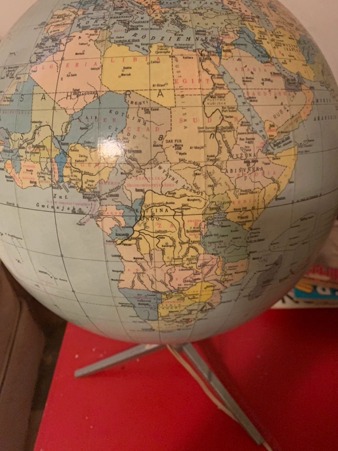 Vintage globe, with a metal stand. Shows countries and major cities in various colours. Has a slight shine to it. It lights up like a night stand lamp. 🪔msg me if interested 🙋🏼♀️