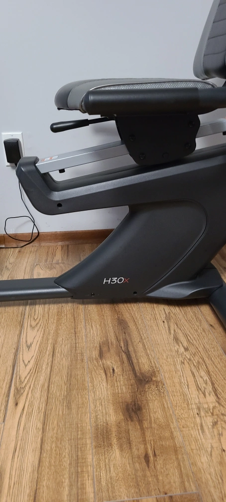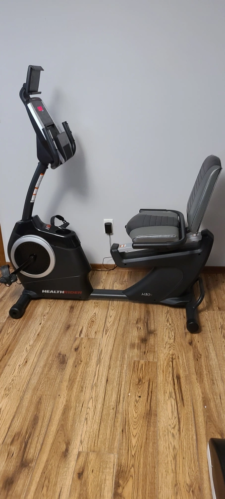 Recumbent exercise bike. Features adjustable seat and resistance levels. Has a digital monitor that displays time, distance, calories, and heart rate. Comes with a tablet holder.